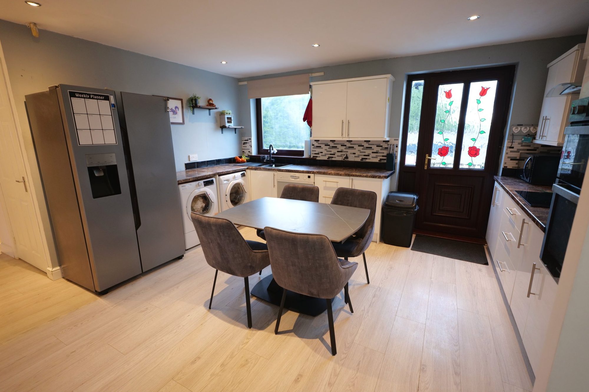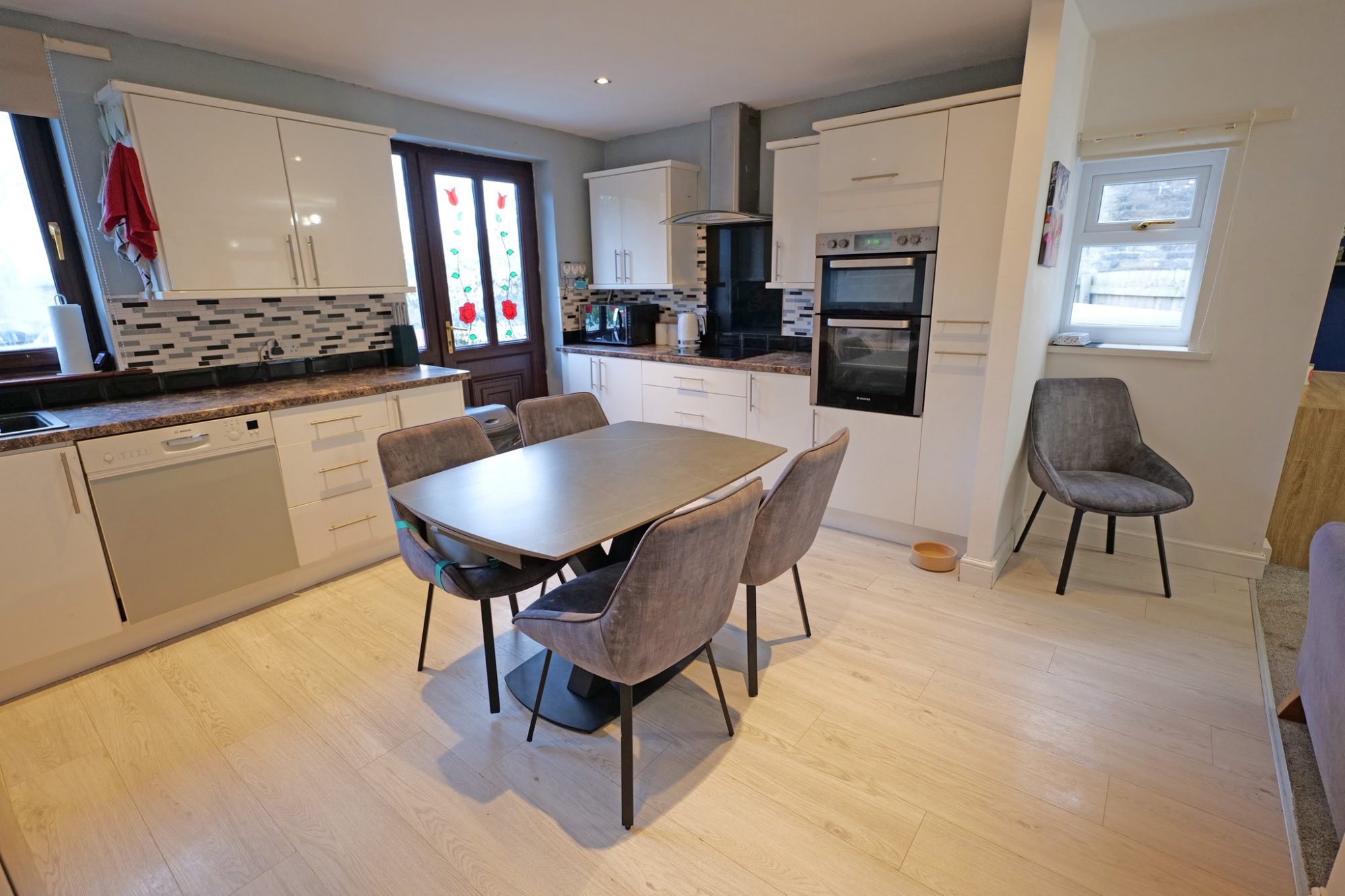 The stylishly fitted kitchen allows ample space for a dining table and is fitted with modern white gloss units, marble effect laminate worktops, tiled splashbacks and a one and a half bowl sink with a mixer tap. Built-in double oven/grill, ceramic hob with stainless steel extractor canopy over, plumbing for a washing machine, space for a condenser tumble dryer and built-in dishwasher. PVC double glazed window and a pvc double glazed window in the side elevation, a radiator and pvc double glazed frosted glass external door with a matching pvc double glazed window at one side.
