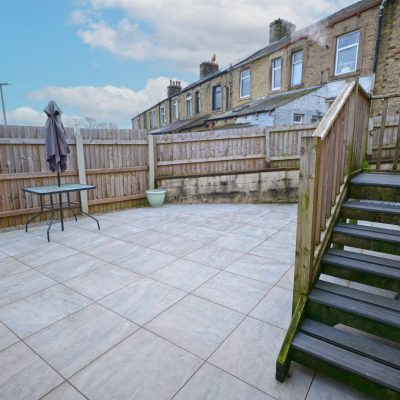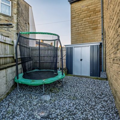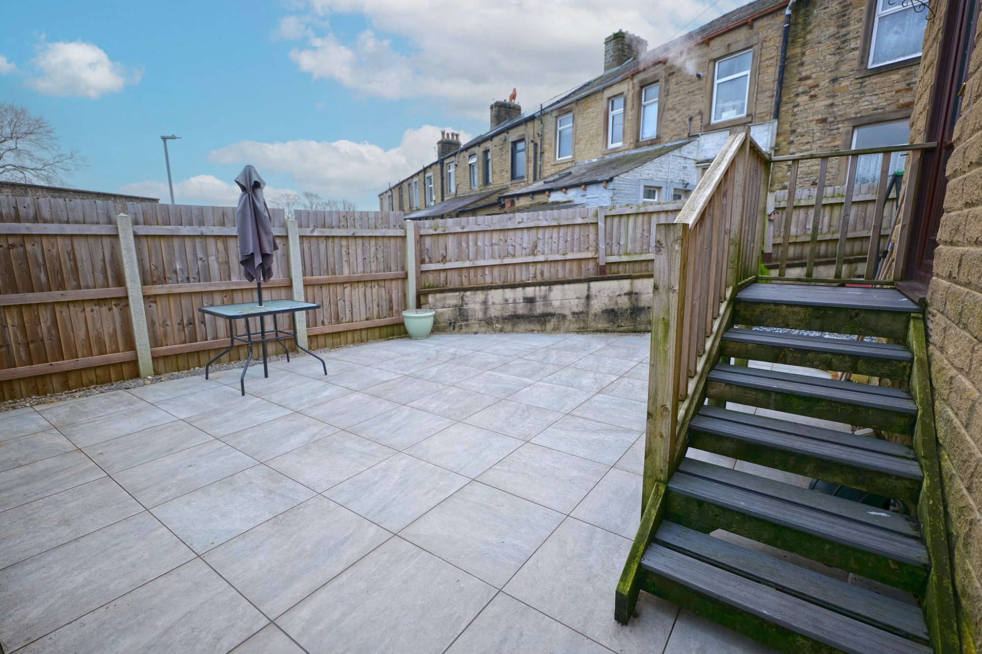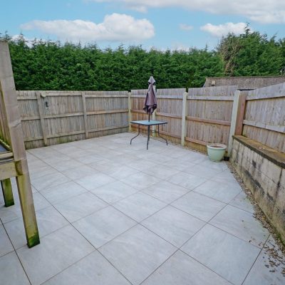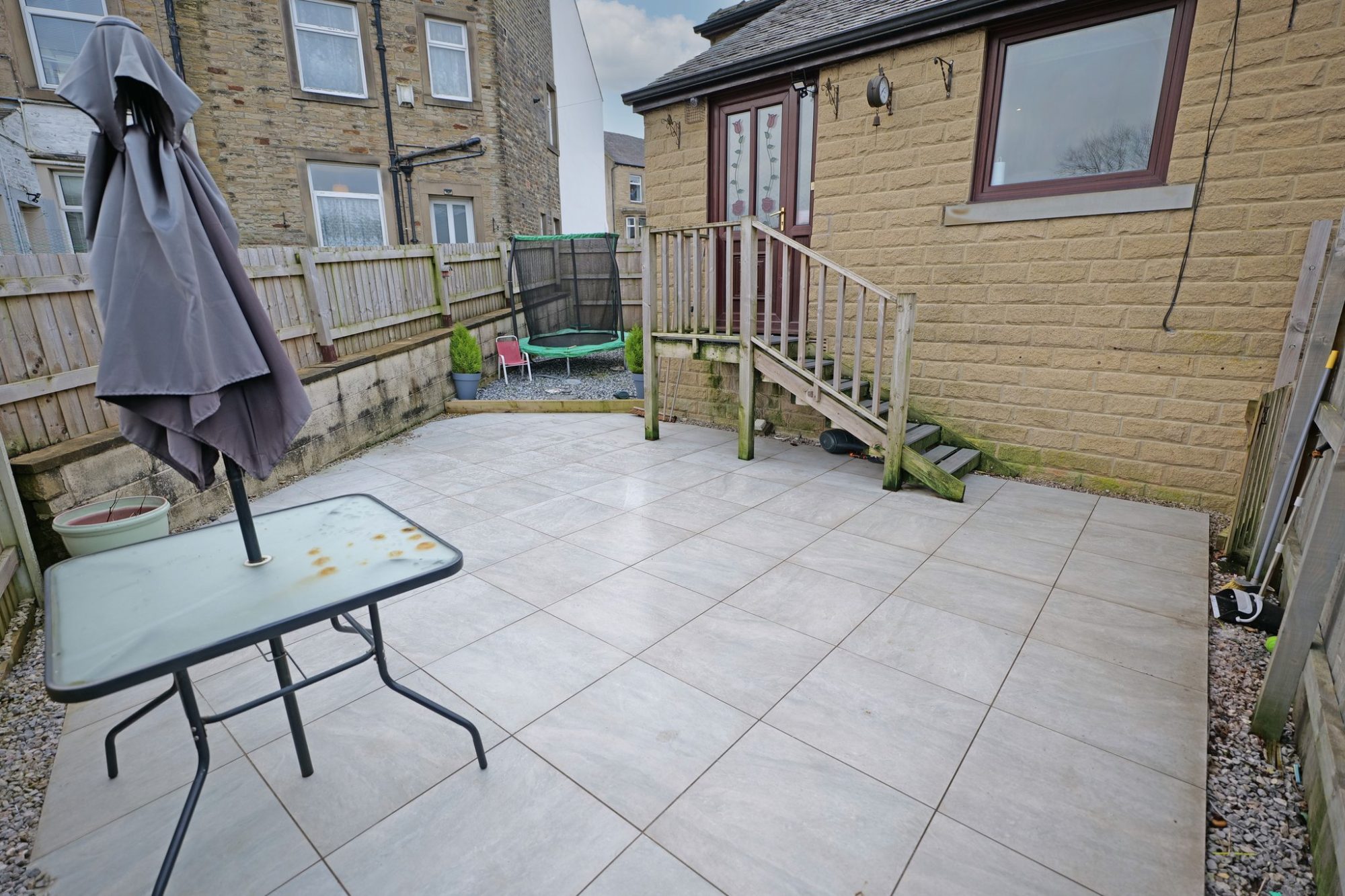 Rear enclosed tiled garden/patio with a gravel covered area to one side and storage shed. Steps leading up to the rear door.