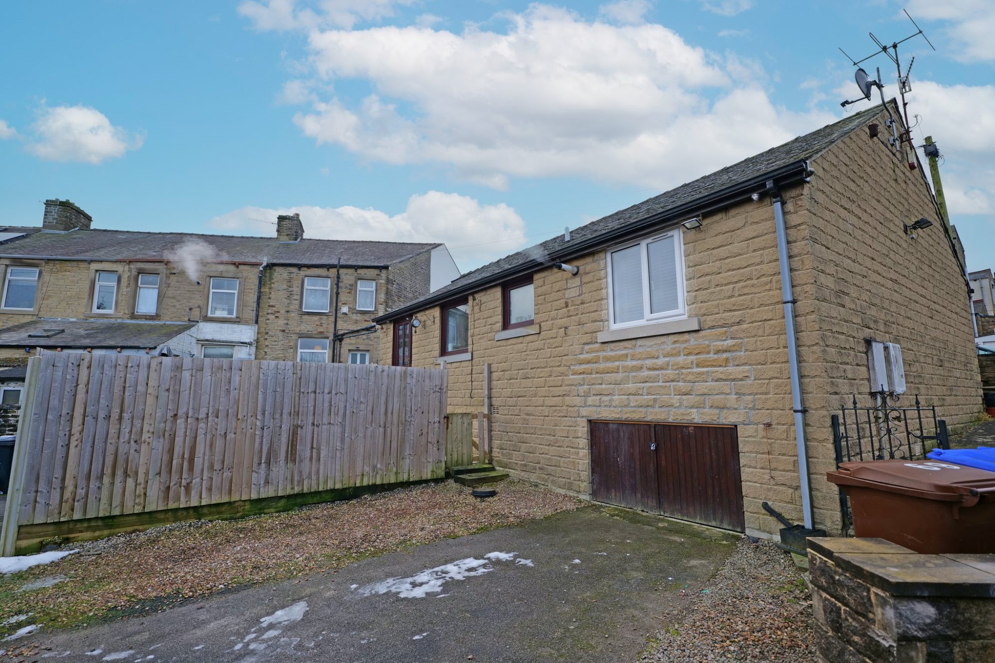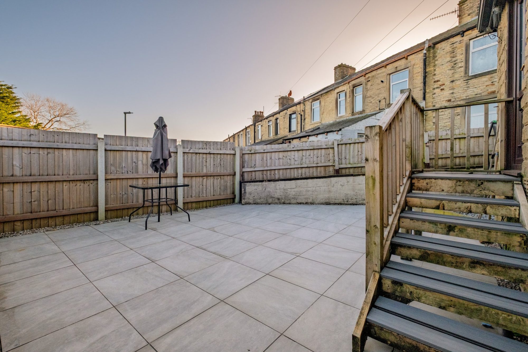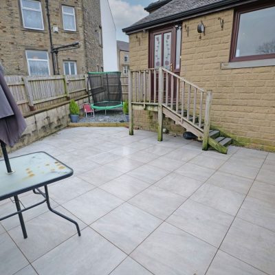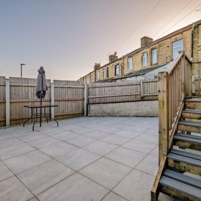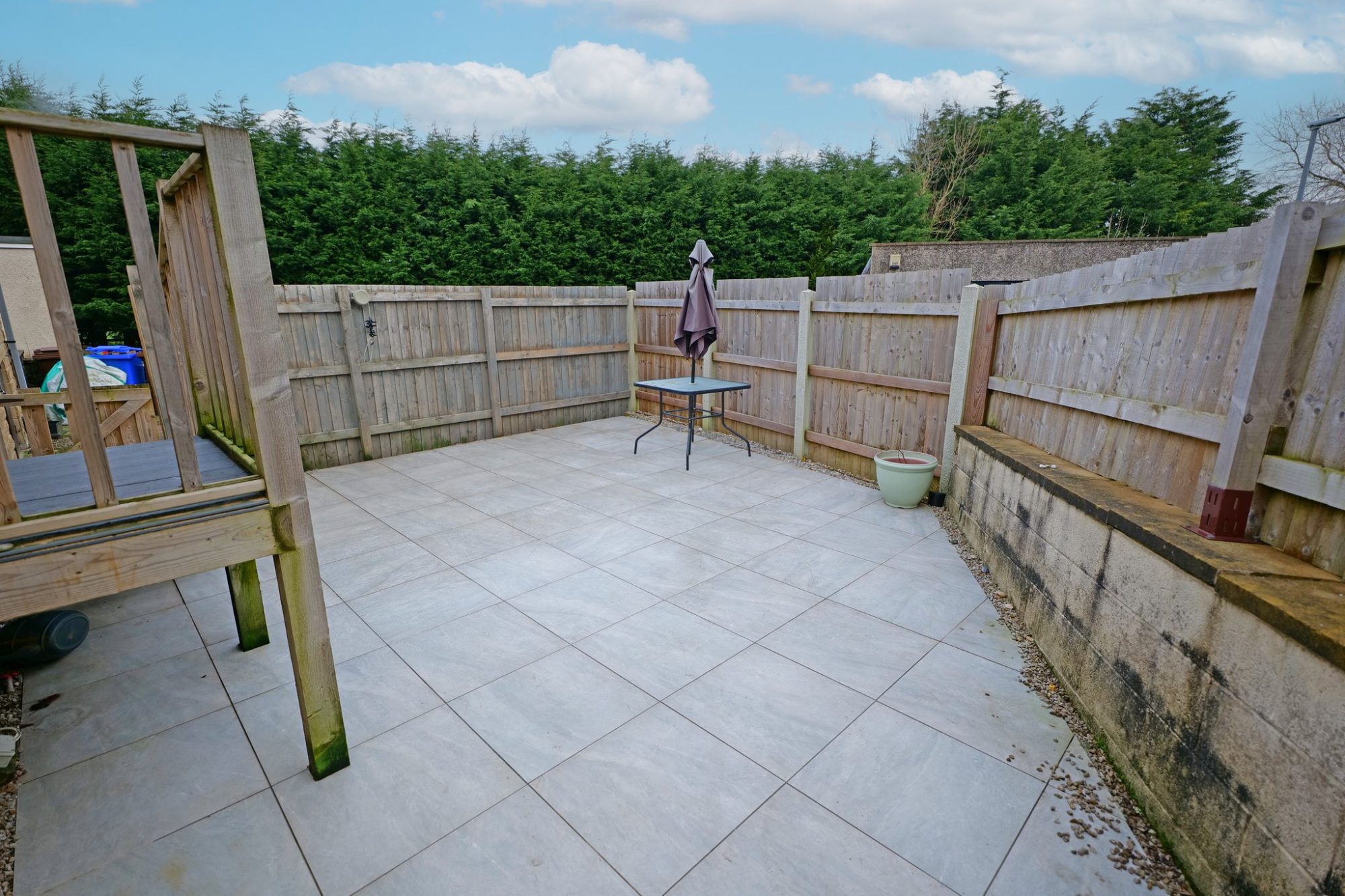 Rear enclosed tiled garden/patio with a gravel covered area to one side and storage shed. Steps leading up to the rear door.