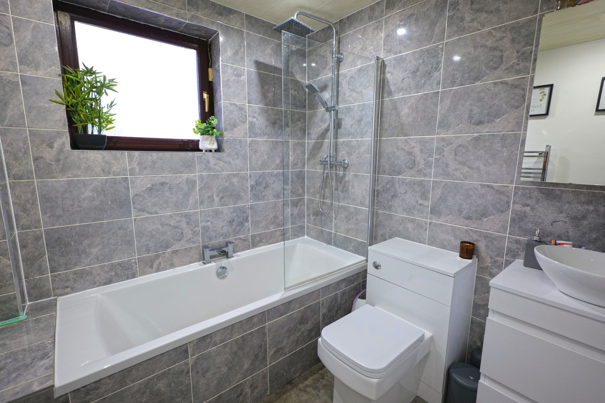 The bathroom is fitted with a modern three piece suite, comprising a double ended bath with a 'waterfall' style mixer tap, a 'rainfall' style shower over with additional shower and a glazed shower screen, a w.c and wash hand basin with a 'waterfall' style mixer tap and sits on a base unit with drawers and mirror fronted cabinet above. Chrome radiator/heated towel rail, downlights recessed into the pvc lined ceiling and Vinyl flooring.