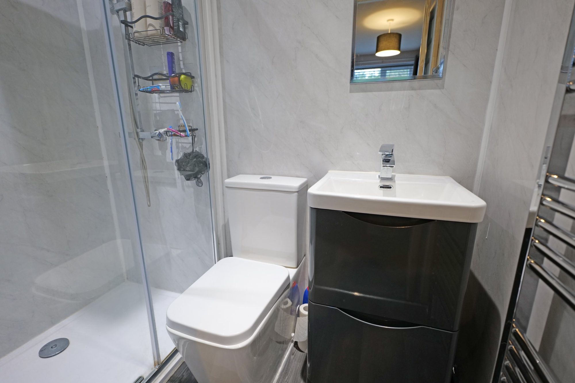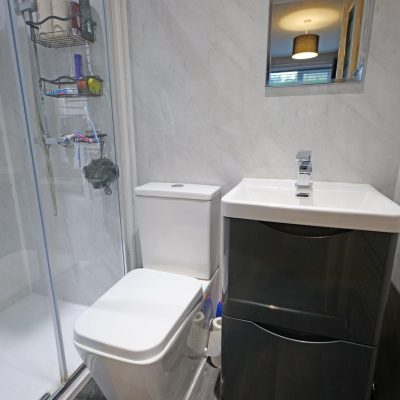A great addition to this bungalow, the en-suite is fully lined with pvc wet wall panelling and fitted with a three piece modern suite comprising a shower with a 'rainfall' style shower and additional shower, a w.c and a wash hand basin with a mixer tap and sits on a base unit with drawers. Chrome radiator/heated towel rail, extractor fan, downlights recessed into the ceiling and wood effect Vinyl flooring.