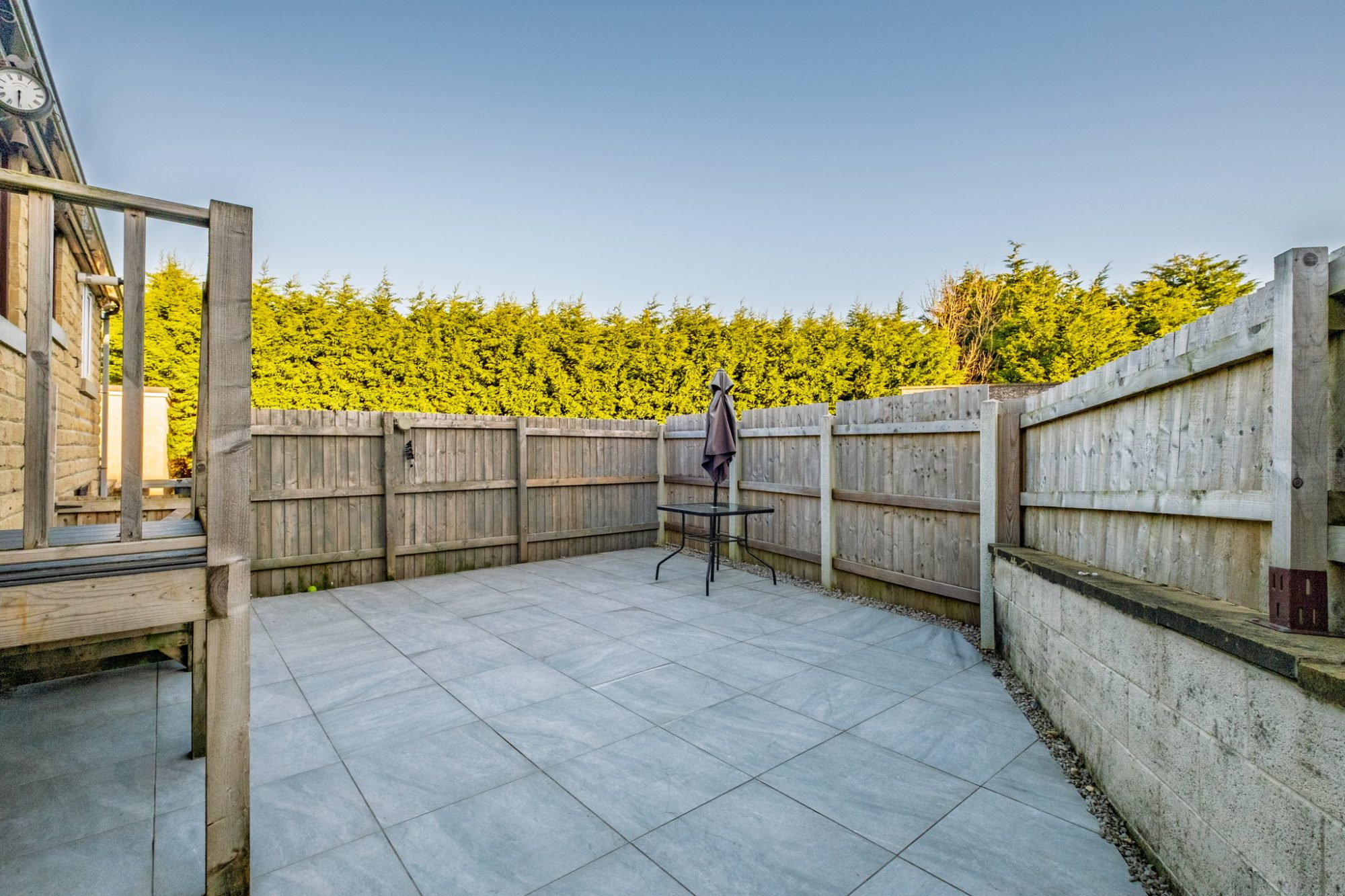 Paved patio and decked patio. Lawn to one side, pathways and pebble covered area and lawn at the other side of the bungalow with a gate giving access to the rear.