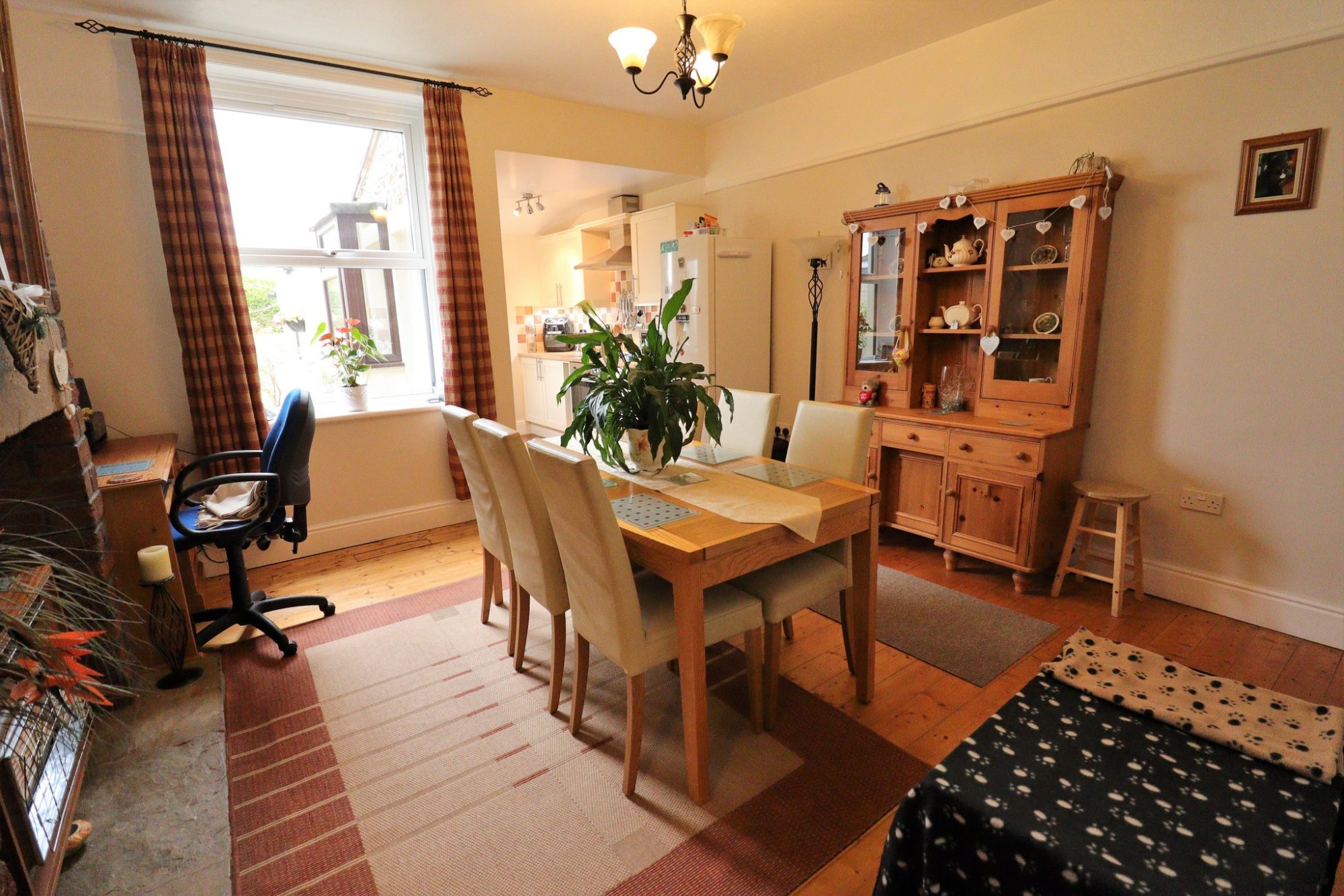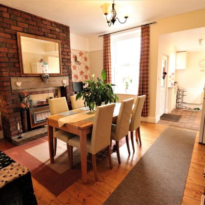 Benefiting from pvc double glazing and gas central heating, the accommodation briefly comprises, an entrance vestibule, hall and a pleasant lounge, with a bay window, a stained wood fireplace and living flame gas fire. The open plan living/dining room and kitchen are an impressive attribute, the living/dining room has a stained wood floor and an exposed brick chimney breast with a fitted gas fire, and the kitchen is attractively furbished with cream shaker style units, a built-in electric oven and hob with an extractor hood over. There are two good sized bedrooms on the first floor, the second bedroom having a built-in single cabin bed and an open aspect, and a larger than average bathroom, fitted with a three piece white suite, with a shower over the bath. To the rear of the house is a paved yard with a substantial outbuilding/external utility.