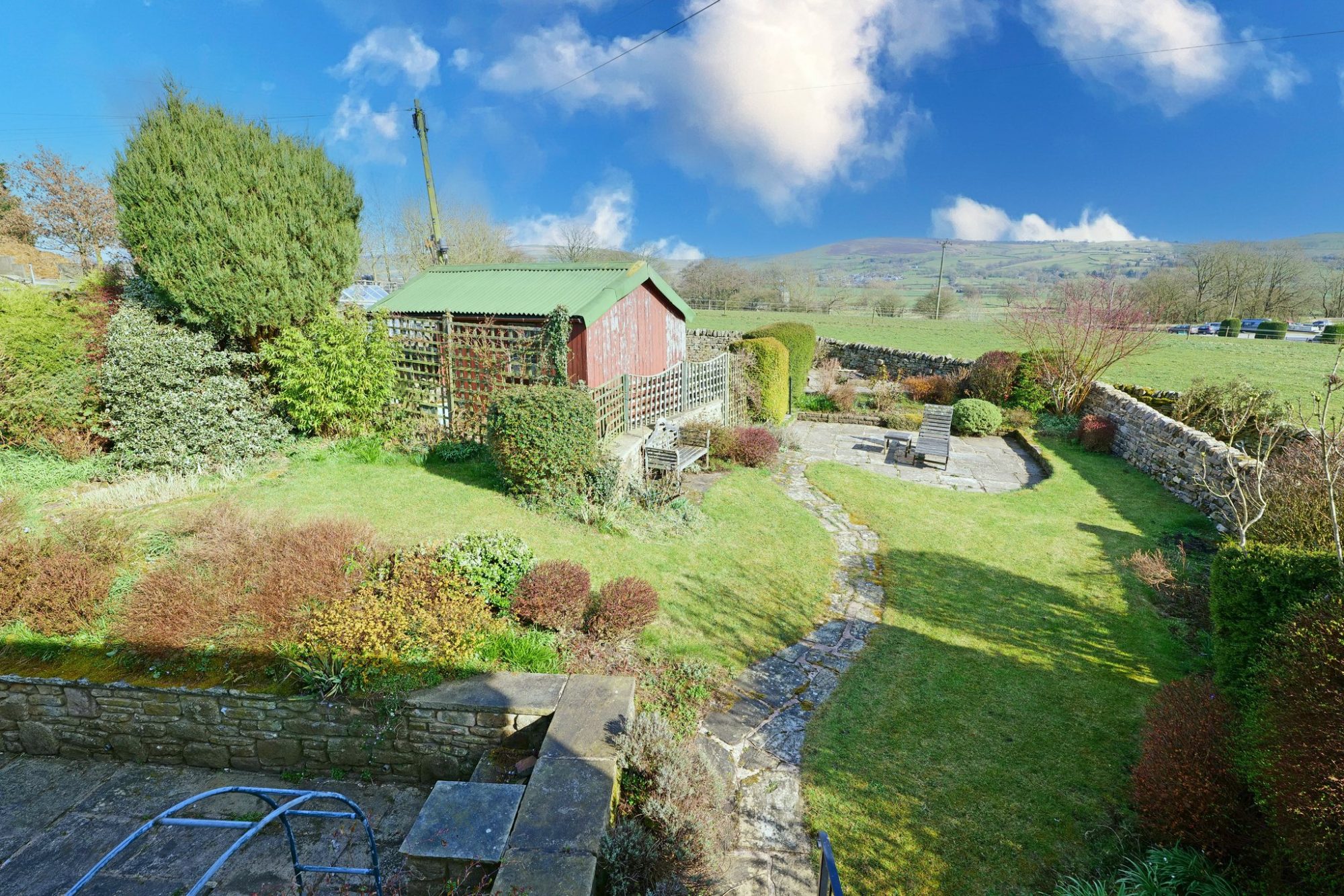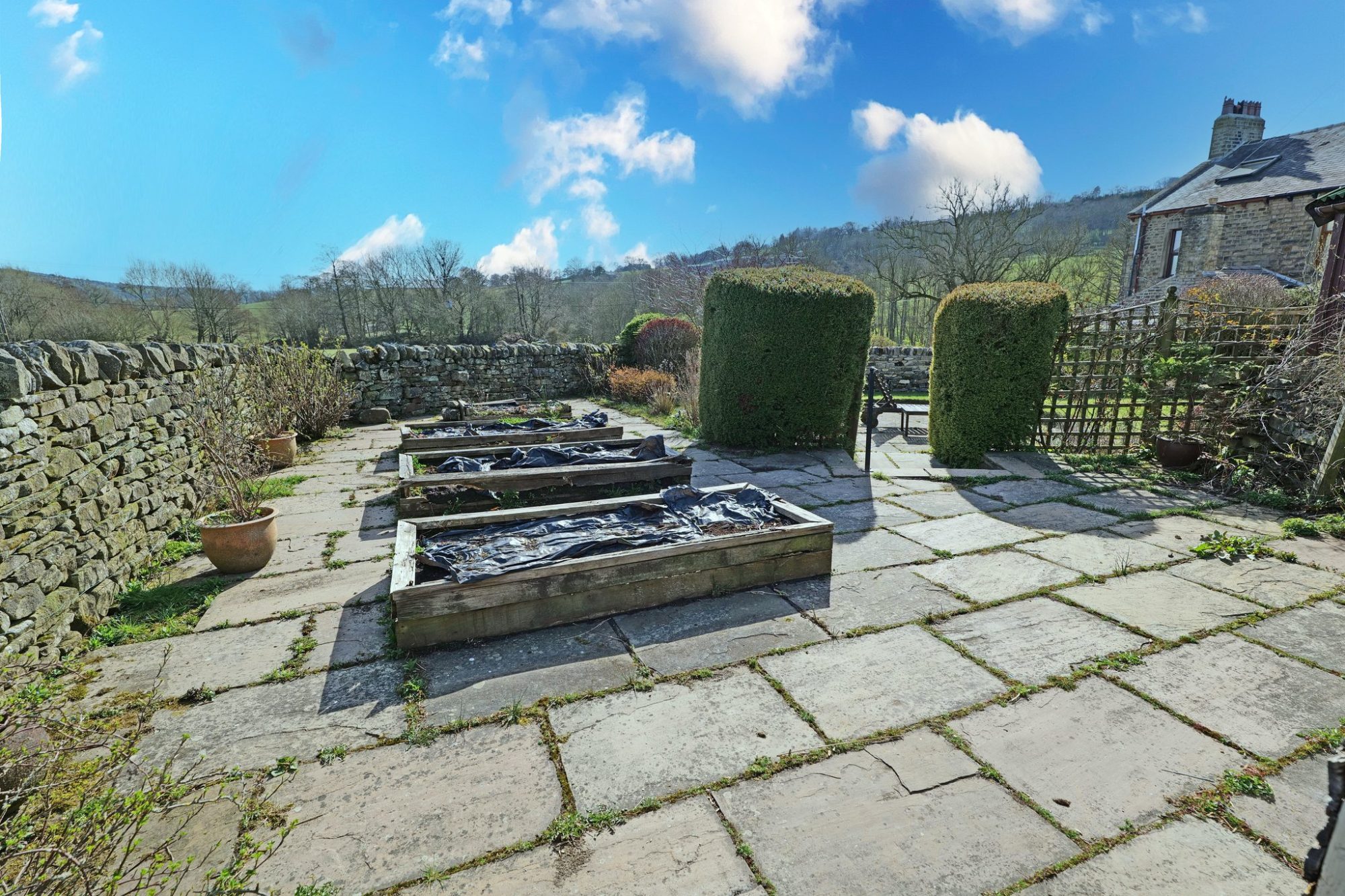 An especially appealing highlight and enticing attribute of this unique dwelling is the good sized, enclosed garden, surrounded by dry stone walls, which directly backs onto open fields and from which there are stunning, far reaching views. There is a large stone flagged patio immediately behind the house, with a couple of steps up to a crazy paved path, with lawns on either side, leading to a second stone flagged patio. A number of garden borders are stocked with a variety of small trees, shrubs and flowering plants and there are additional, slightly raised garden beds, ideal for growing vegetables and/or fruit bushes, set into another stone flagged area. There is also an external electric light and a cold water tap at the rear.