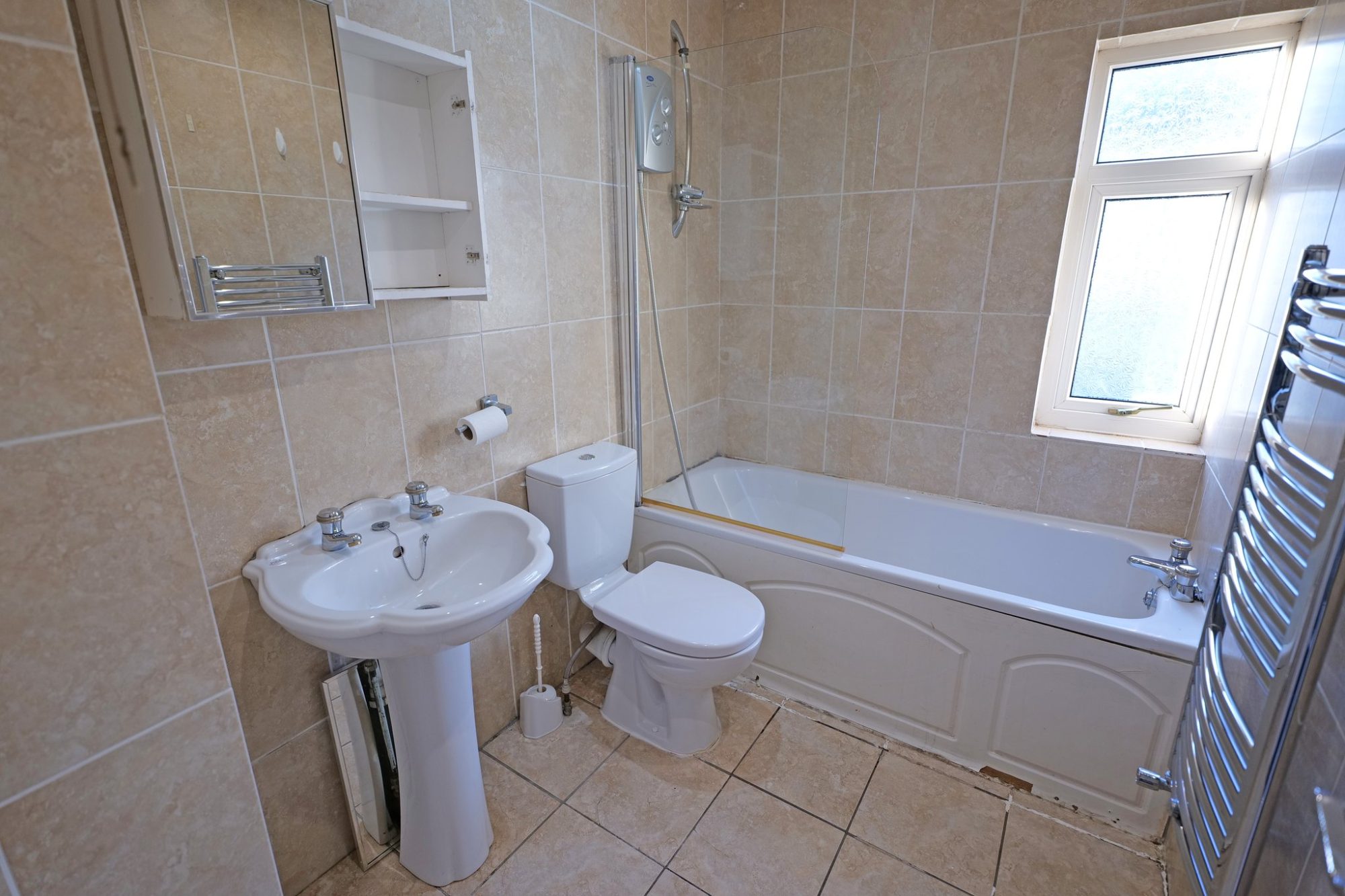 Fully tiled and fitted with a three piece white suite comprising a bath with an electric shower over, a pedestal wash hand basin and a w.c. PVC double glazed frosted glass window and chrome radiator/heated towel rail and tiled floor.