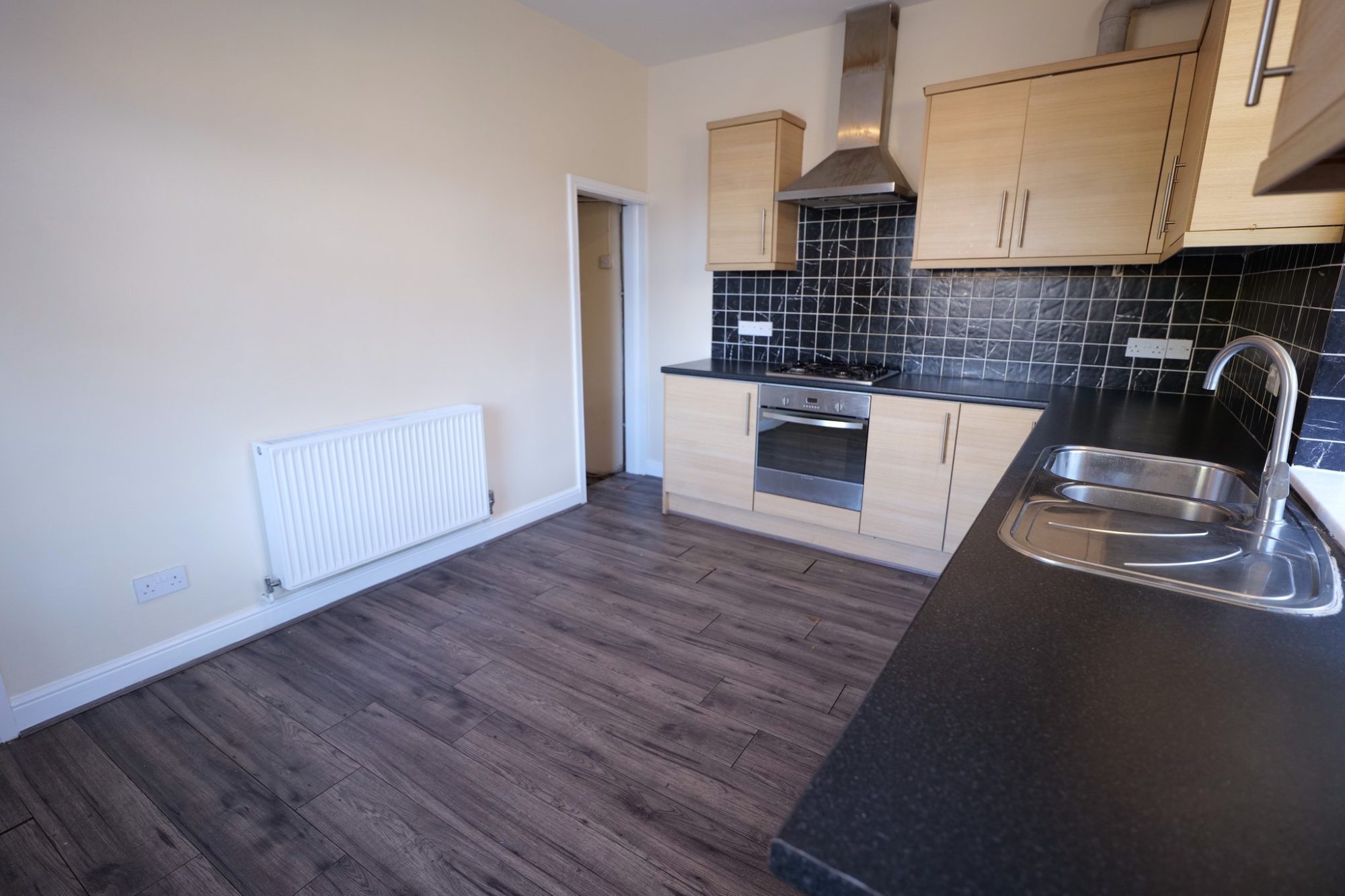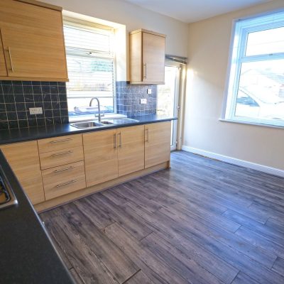 Complemented by pvc double glazing and gas central heating, the accommodation briefly comprises a sitting room, which is laid with wood finish laminate flooring and has a fireplace fitted with an electric stove and a good sized dining kitchen which has modern wood finish units, incorporating a built-in electric oven and hob, with a stainless-steel extractor canopy over.