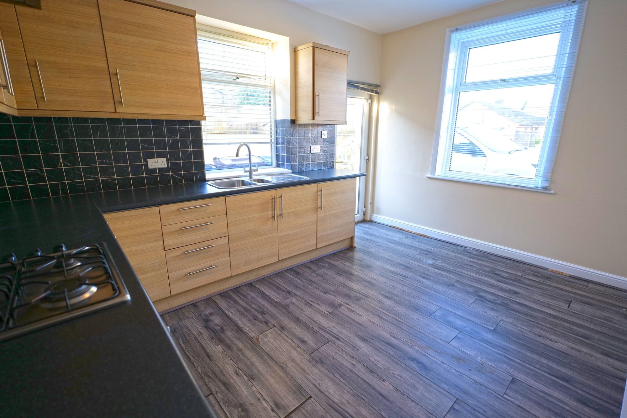 The good sized, light and airy kitchen is fitted with modern wood effect units, laminate worktops with tiled splashbacks and a one and a half bowl sink, with a mixer tap. Built-in electric oven and a gas hob with a stainless steel extractor canopy over. Two pvc double glazed windows, understairs storage area and pvc double glazed external door. Gas combination boiler concealed within a cupboard matching the units.