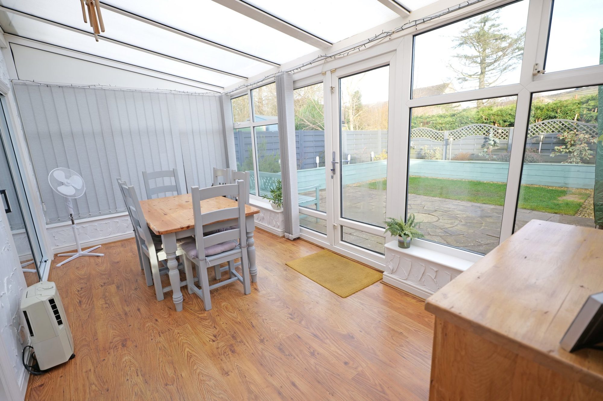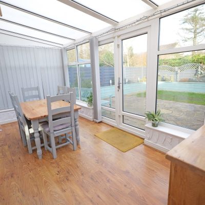 A particularly beneficial addition, the large pvc double glazed conservatory has wood finish laminate flooring, a wall light point, wall mounted electric heater, a pvc double glazed French door leading out to the rear garden and a pvc door giving internal access into the garage.