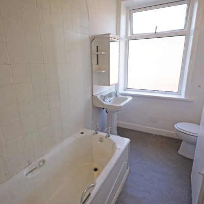 Fitted with a three piece white suite, comprising a cast iron bath, with an electric shower over, a pedestal wash hand basin and a w.c., the bathroom also has a pvc double glazed, frosted glass window, radiator and built-in storage cupboards, one housing the gas combination central heating boiler.