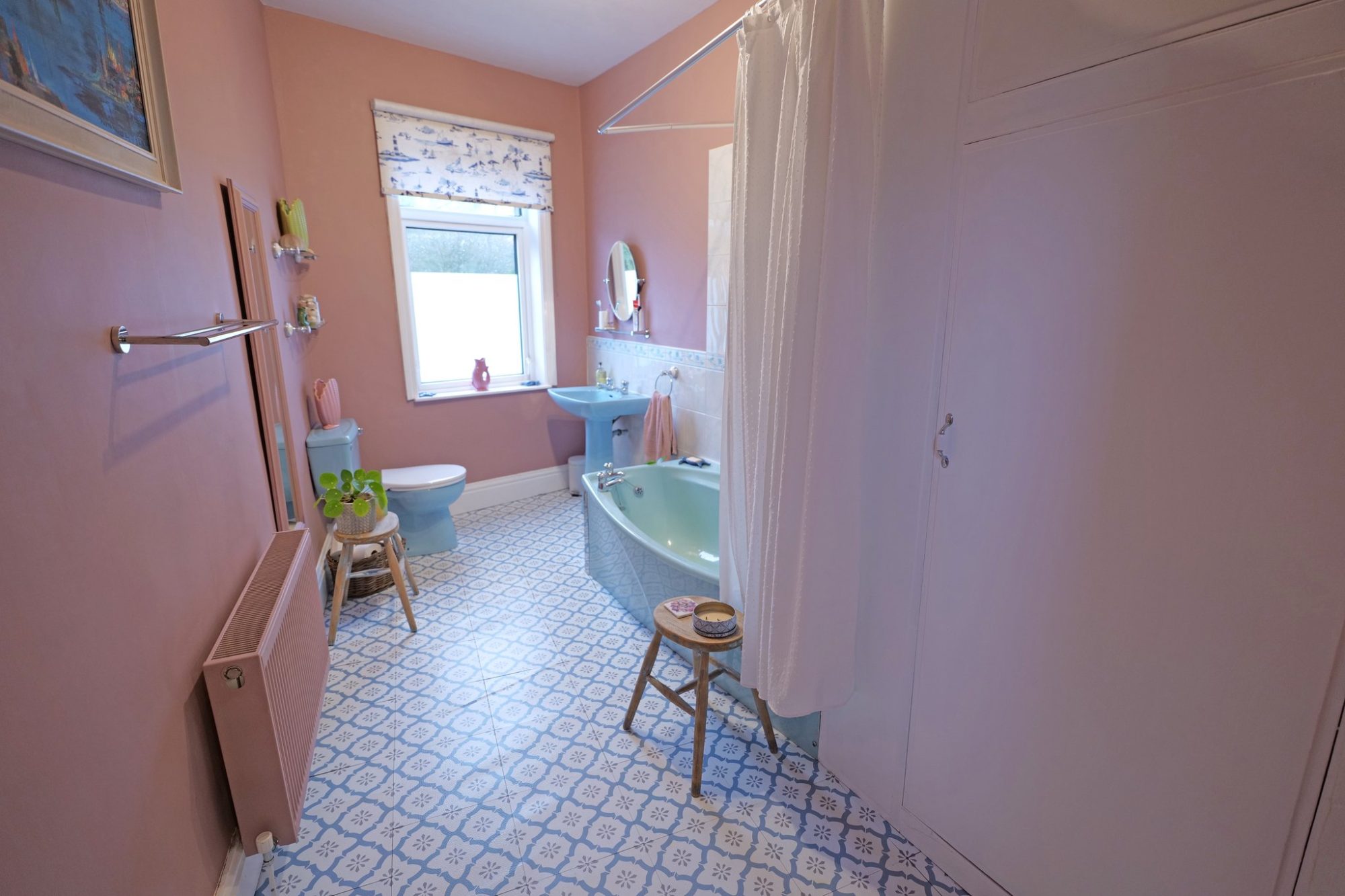 The larger than standard bathroom is fitted with a three piece suite, comprising a bath, with a shower over, tiled splashback, a pedestal wash hand basin and a w.c. PVC double glazed window overlooking the garden at the rear, radiator and built-in shelved cupboard, with an overhead cupboard, providing plenty of linen storage space.