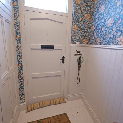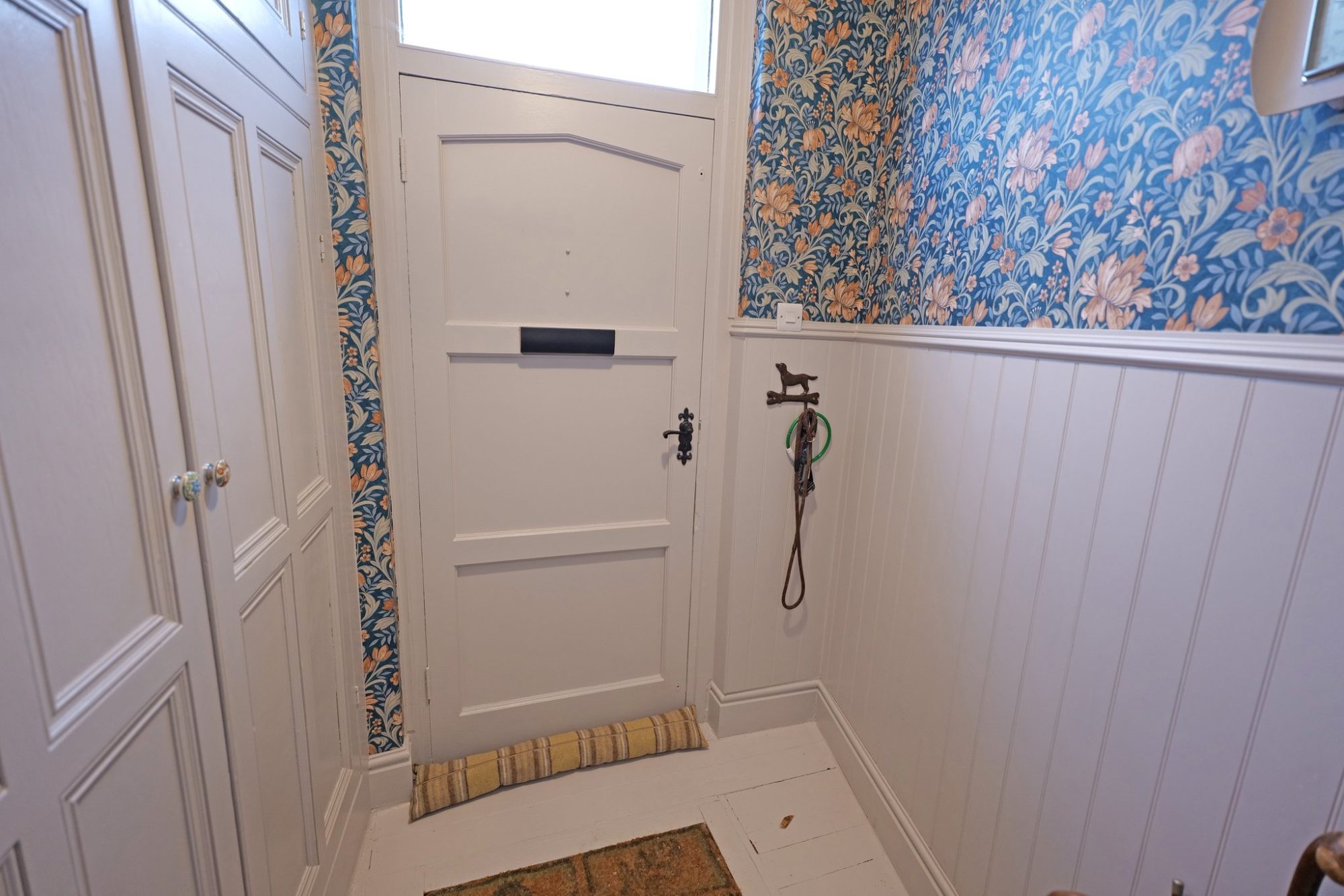 Entrance door with a window light above. Built-in shelved storage cupboards, panelling on one wall, exposed painted wood flooring, door opening into the hall.