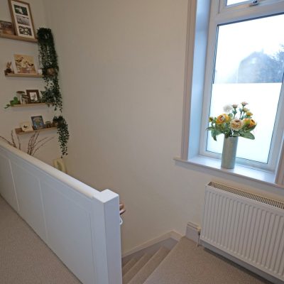Enclosed stairs to the second floor, over stairs storage cupboard, radiator and a pvc double glazed window, with an open aspect.