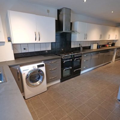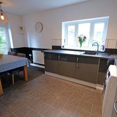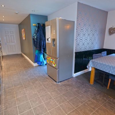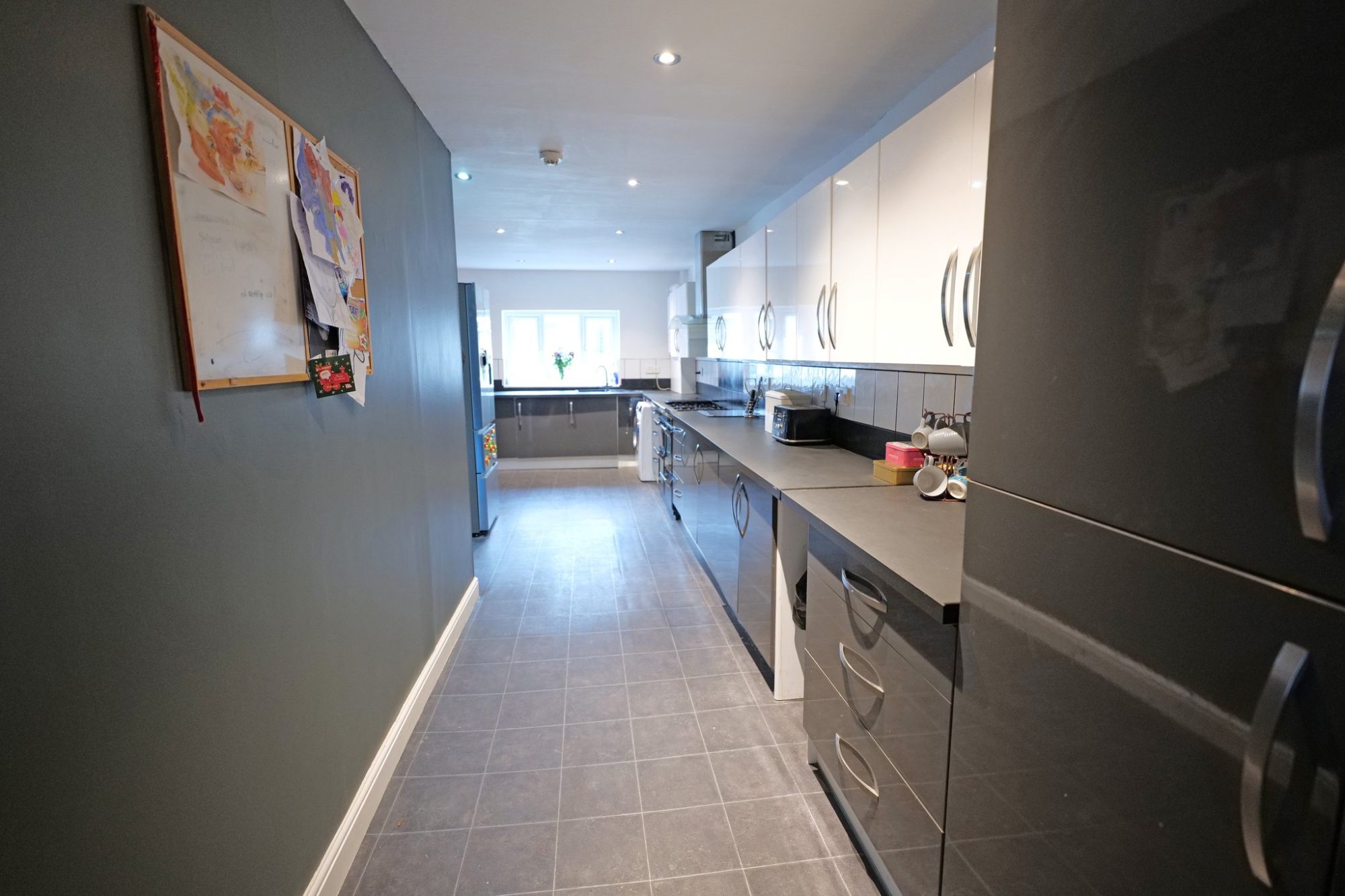 The large kitchen is an impressive attribute and is extensively fitted with gloss fronted units, laminate worktops with tiled splashbacks and a single drainer sink, with a mixer tap. Range style cooker with a seven ring gas hob with a stainless steel extractor canopy over and integral fridge and freezer and plumbing for a washing machine. There are pvc double glazed French doors, a pvc double glazed window and a pvc double glazed external door. Wall mounted gas combination boiler.