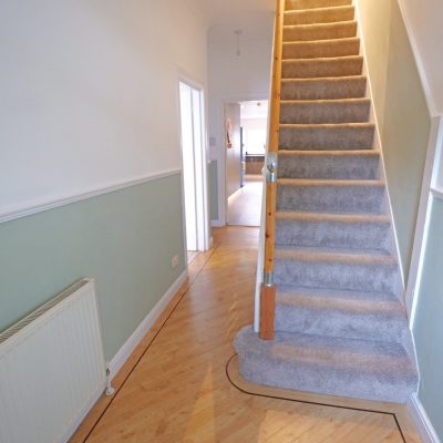 PVC double glazed entrance door with window light above. Open stairs to the first floor with a wood and chrome spindled balustrade, Karndean flooring and a radiator. Understairs storage cupboard which has a wash hand basin, radiator and tiled walls and by adding a w.c, could provide a ground floor w.c, if required.