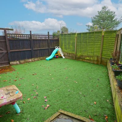 Garden covered with artificial grass for lower maintenance. There is a pathway down the side of the house, leading to the rear.