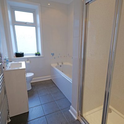 Majority tiled and fitted with a four piece white suite comprising a bath, a larger than standard shower cubicle, a w.c. and a wash hand basin, with a cabinet below. PVC double glazed frosted glass window, tiled floor, chrome radiator/heated towel rail and downlights recessed into the ceiling.