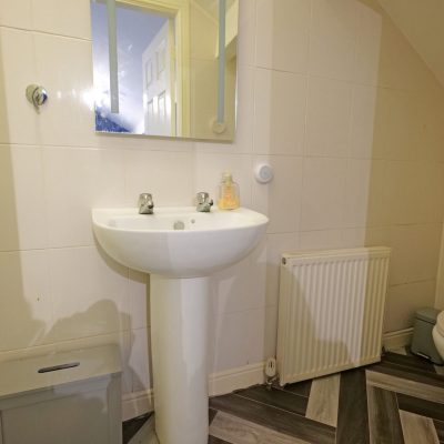 Fully tiled and fitted with a three piece white suite comprising a larger than standard shower cubicle with an electric shower, a pedestal wash hand basin and a w.c. Radiator and extractor fan.