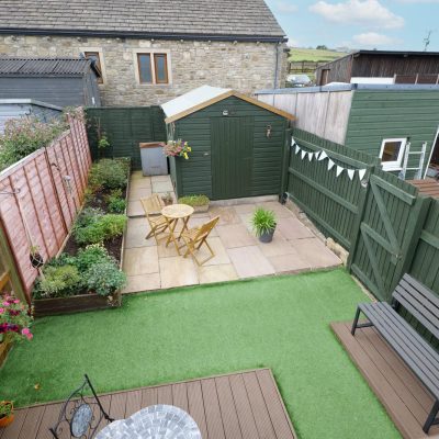 Laid with Indian stone flags which provides a nice patio area and a stone flagged pathway leading to the front door. External light and cold water tap.