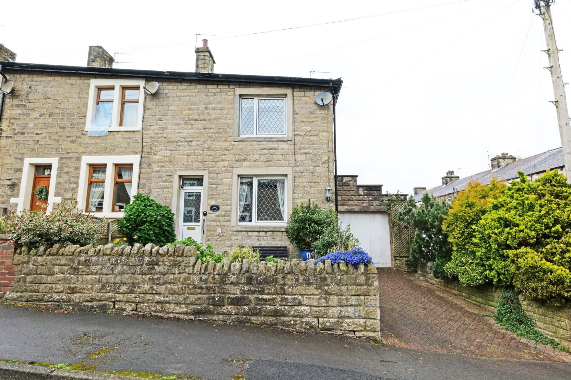 The charming garden at the front has raised, stone walled flower beds, bursting with a variety of flowering plants, shrubs and holly bushes. A block paved driveway provides off road parking and there is a further raised, stone walled garden bed extending down one side of the drive, in which there are mature conifers and a pine tree. A stone archway gives access from the driveway to a stone flagged path, which leads to the side and rear garden.