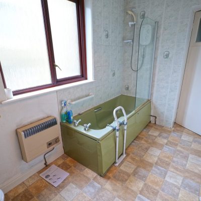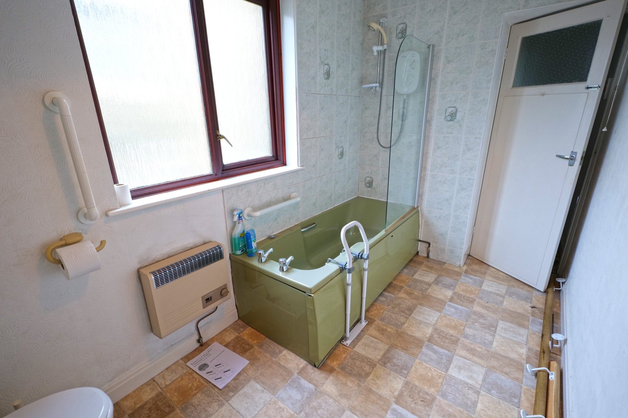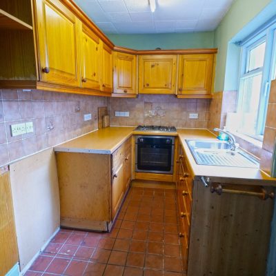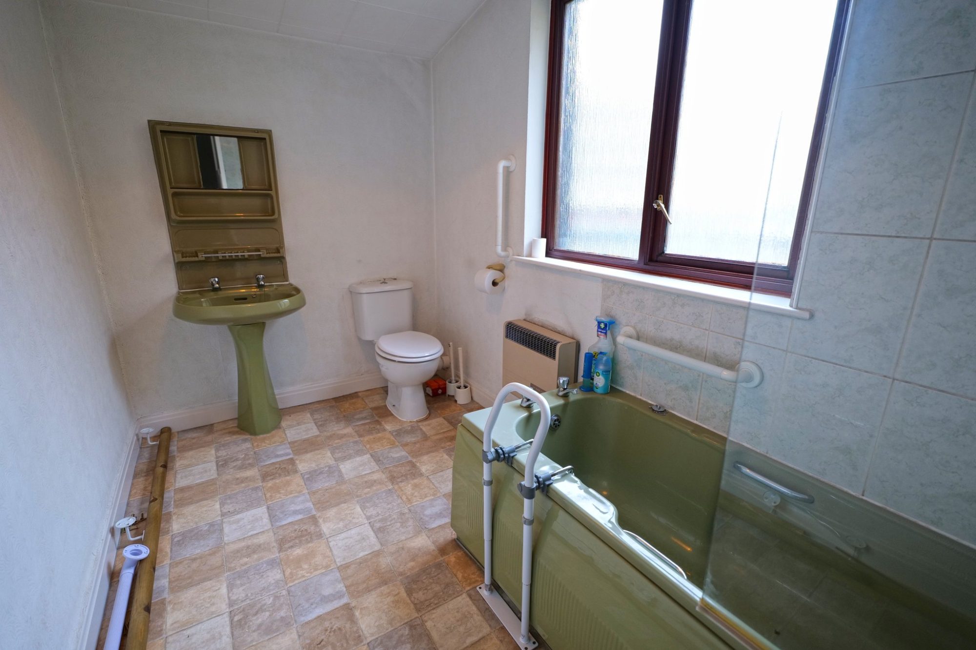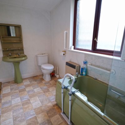 With hardwood double glazing, the accommodation briefly comprises an entrance hall leading to a spacious through lounge and living/dining room. The lounge features a large bay window and a fireplace with fitted gas fire, and the living/dining room has a stone fireplace with a solid fuel fire. The nice sized kitchen has fitted units with a built-in electric oven and a five ring gas hob with an extractor above.