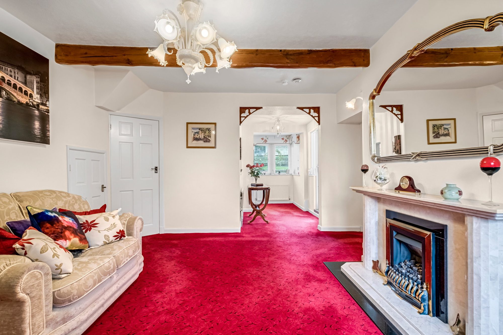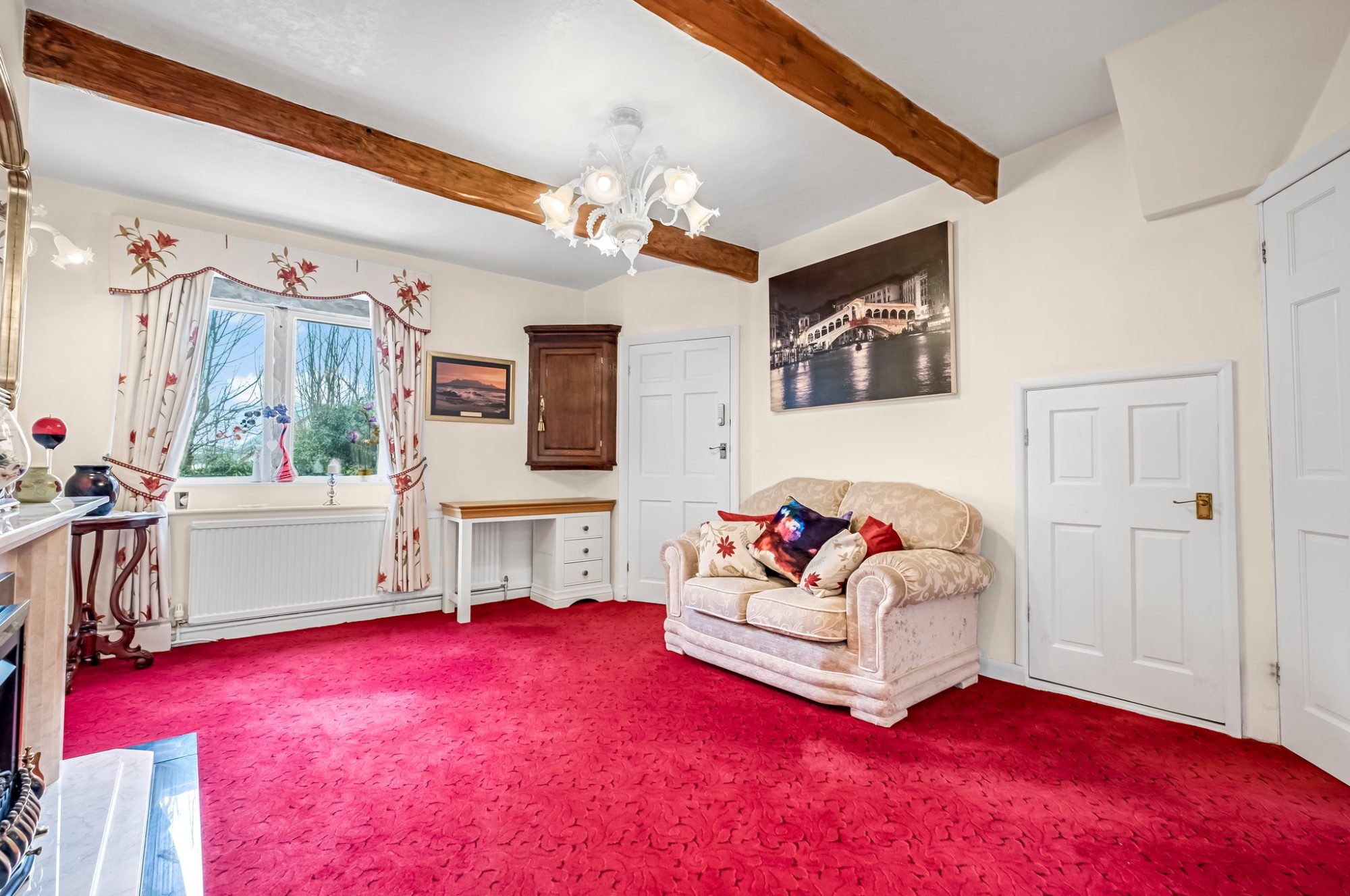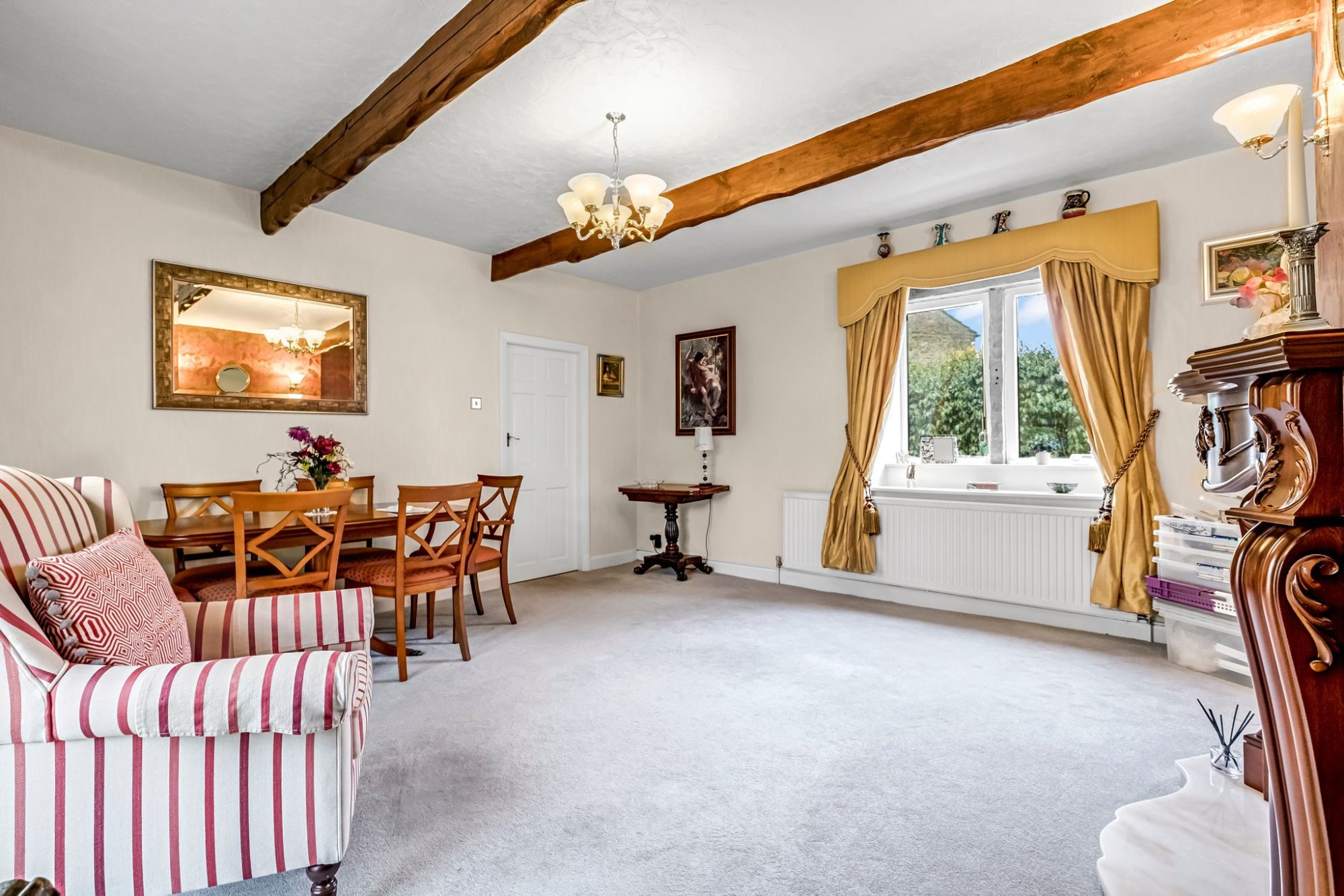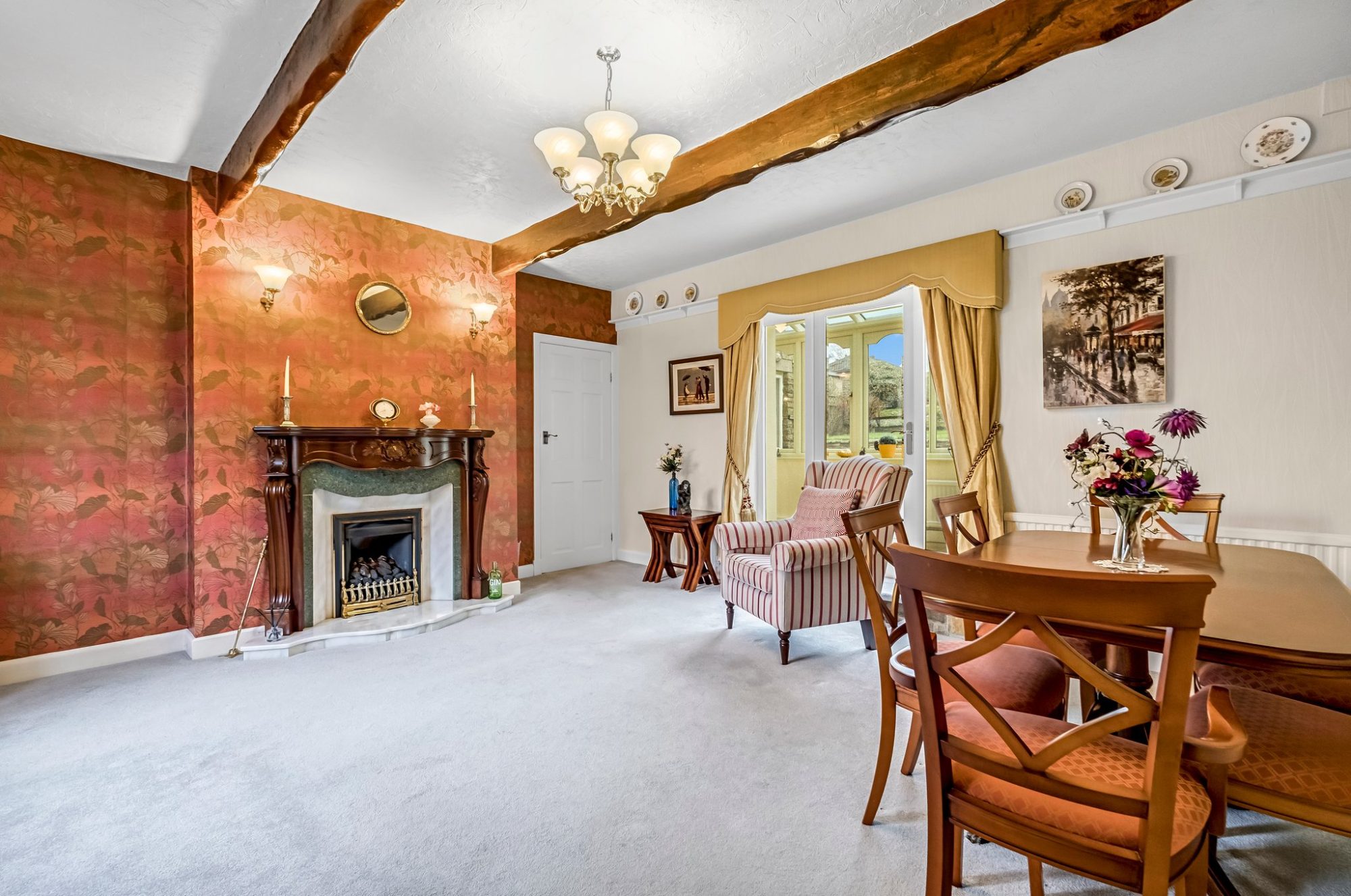 The most delightful room, the good sized lounge has a carved stained wood fireplace with a marble inset and hearth and is fitted with a living flame gas fire, double glazed mullion window and glazed French door with windows either side which open into the garden room. Two radiators, wall light points and exposed beams to the ceiling.
