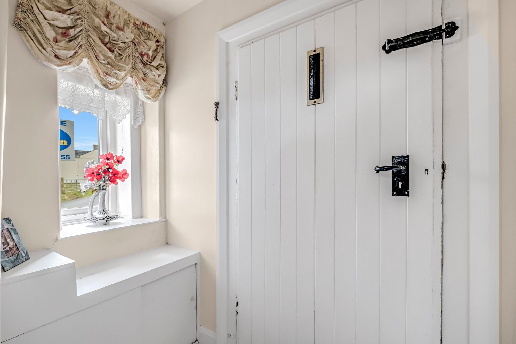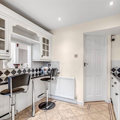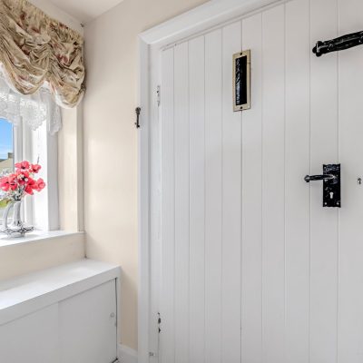 A crazy paved path and a flower bed which is directly in front of this charming abode, extends fully across the property and is stocked with small shrubs and flowering plants. There are window boxes attached to the two main ground floor windows which also have decorative window shutters.