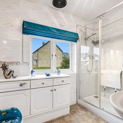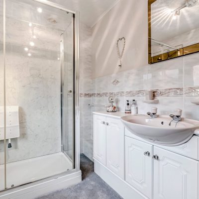 Fitted with a three piece suite, comprising a double sized shower cubicle, wash hand basin and w.c both of which are built into vanity units. Part tiled walls, double glazed window and a radiator.