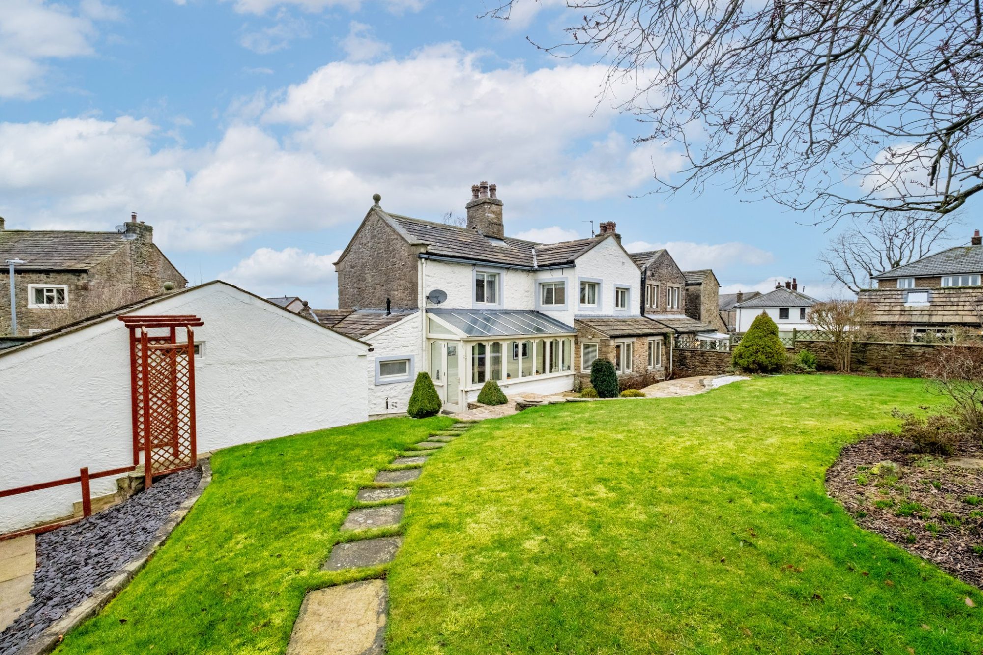 Benefiting from gas central heating and partial double glazing, the accommodation briefly comprises an entrance porch, hallway and a well proportioned living/dining room, which has mullion windows and a marble fireplace fitted with a living flame gas fire. The pleasant lounge is a delightful, good sized second reception room, has a fireplace fitted with a living flame gas fire, mullion windows and a French door opening into the fabulous garden room, which is an advantageous addition and overlooks the beautiful garden at the rear. The breakfast kitchen is also a nice size and is attractively furbished with a quality, farmhouse style kitchen, quartz worktops and built-in appliances, namely an electric double oven/grill, a ceramic hob, a microwave and integral fridge and freezer. There is a useful utility room/ground floor w.c. and a side entrance porch.