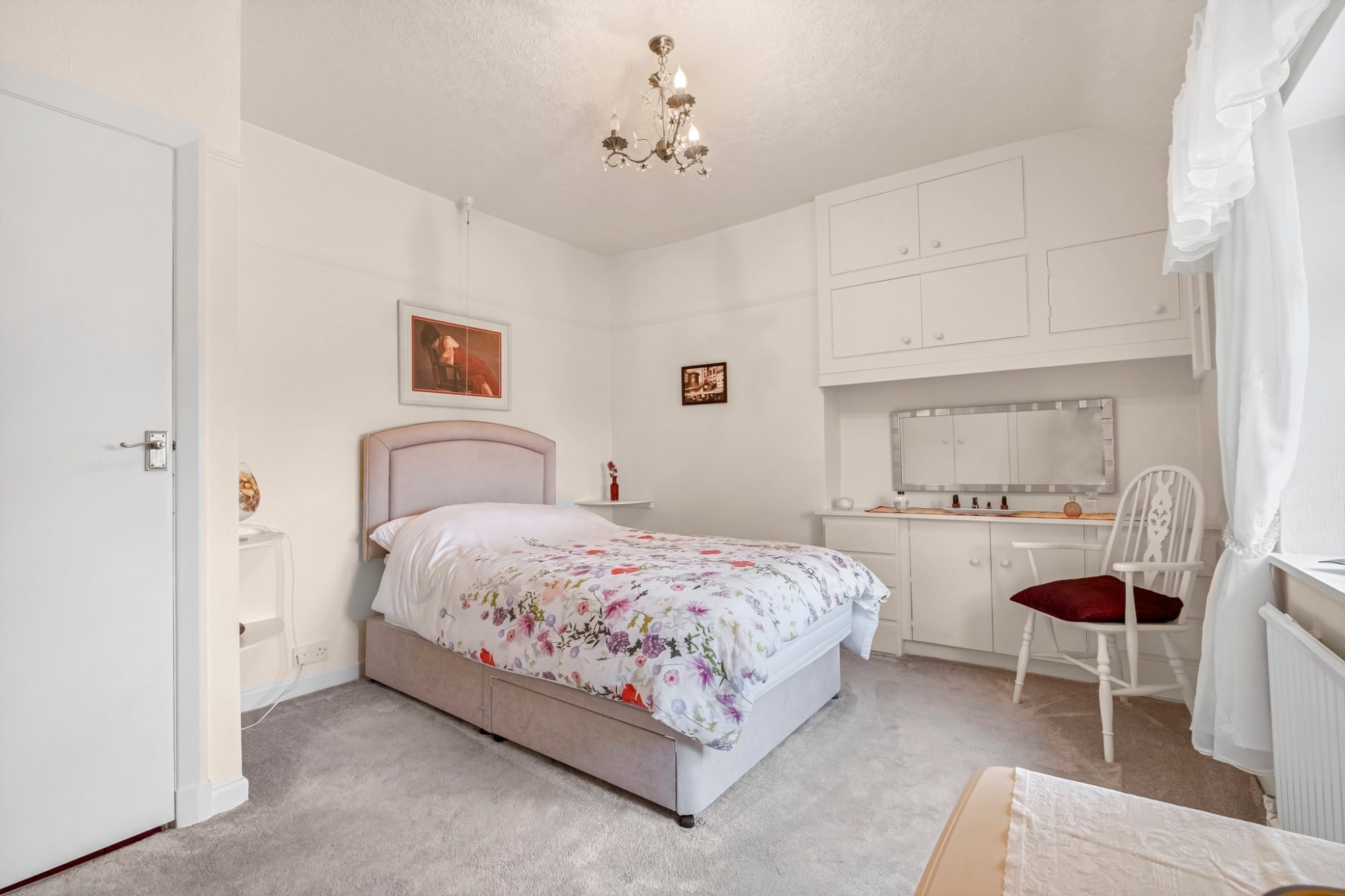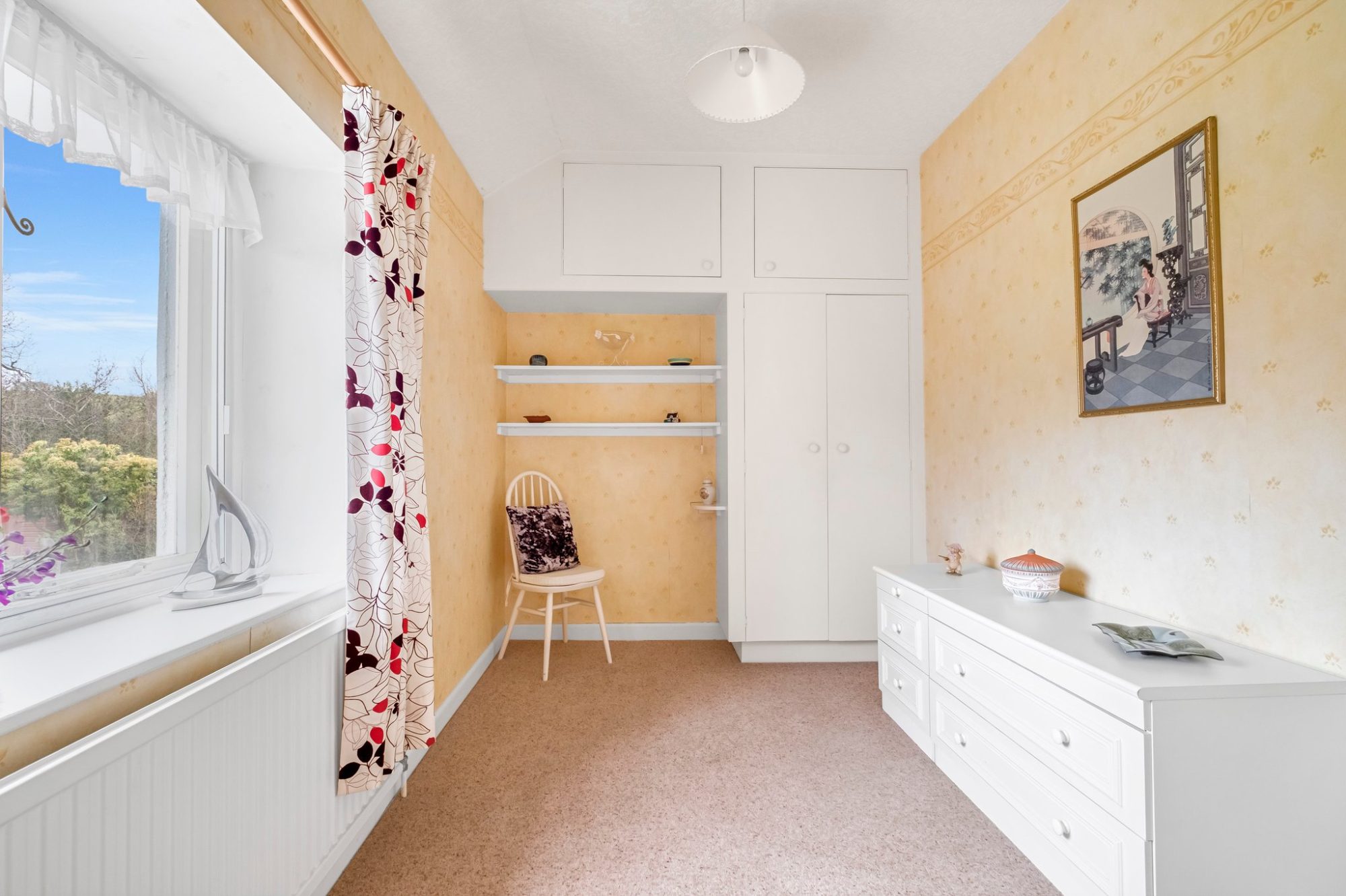 This double room has built-in wardrobes with overhead storage cupboards and a dressing table with a cupboard below and drawers either side and storage cupboard above. A radiator, mullion windows with secondary double glazing with far reaching views.