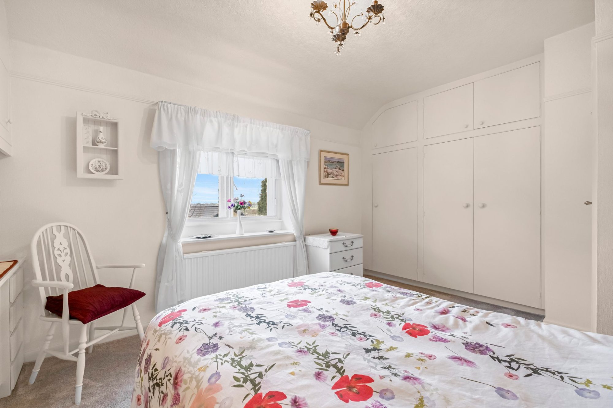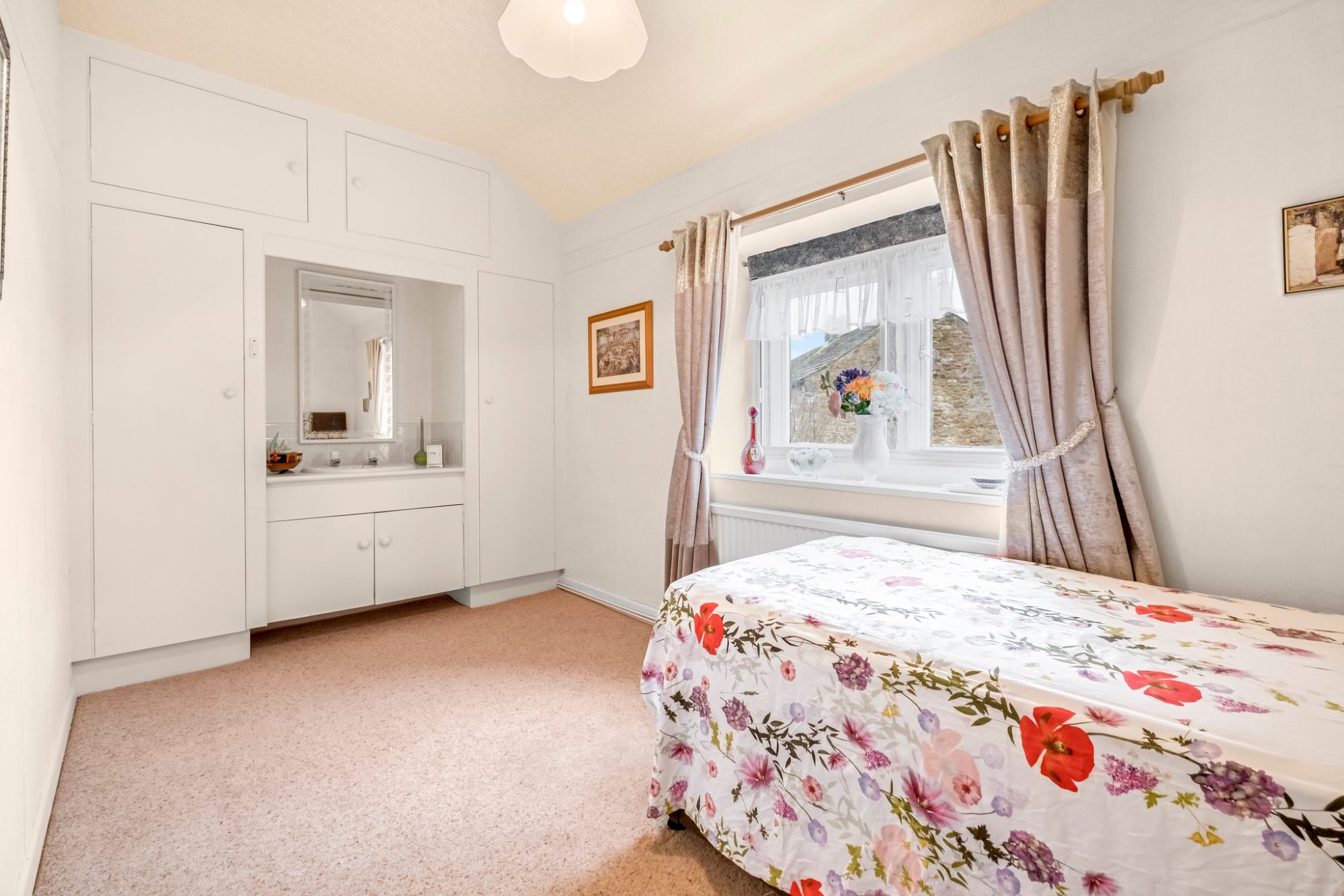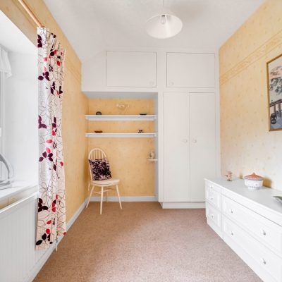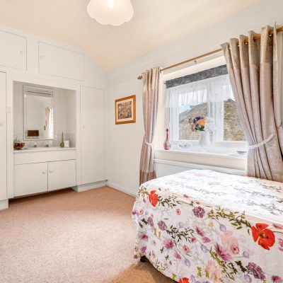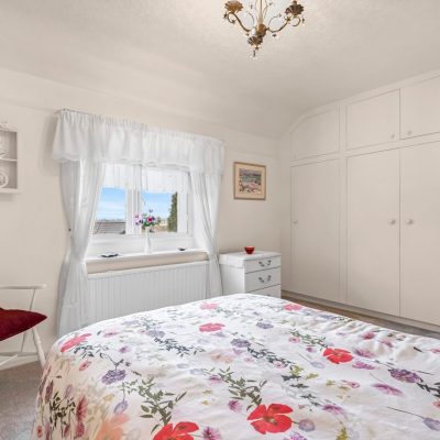 This second double room has a sink with a cupboard below, wardrobes either side and storage cupboards above. Radiator and mullion windows with secondary double glazing with long distance views.