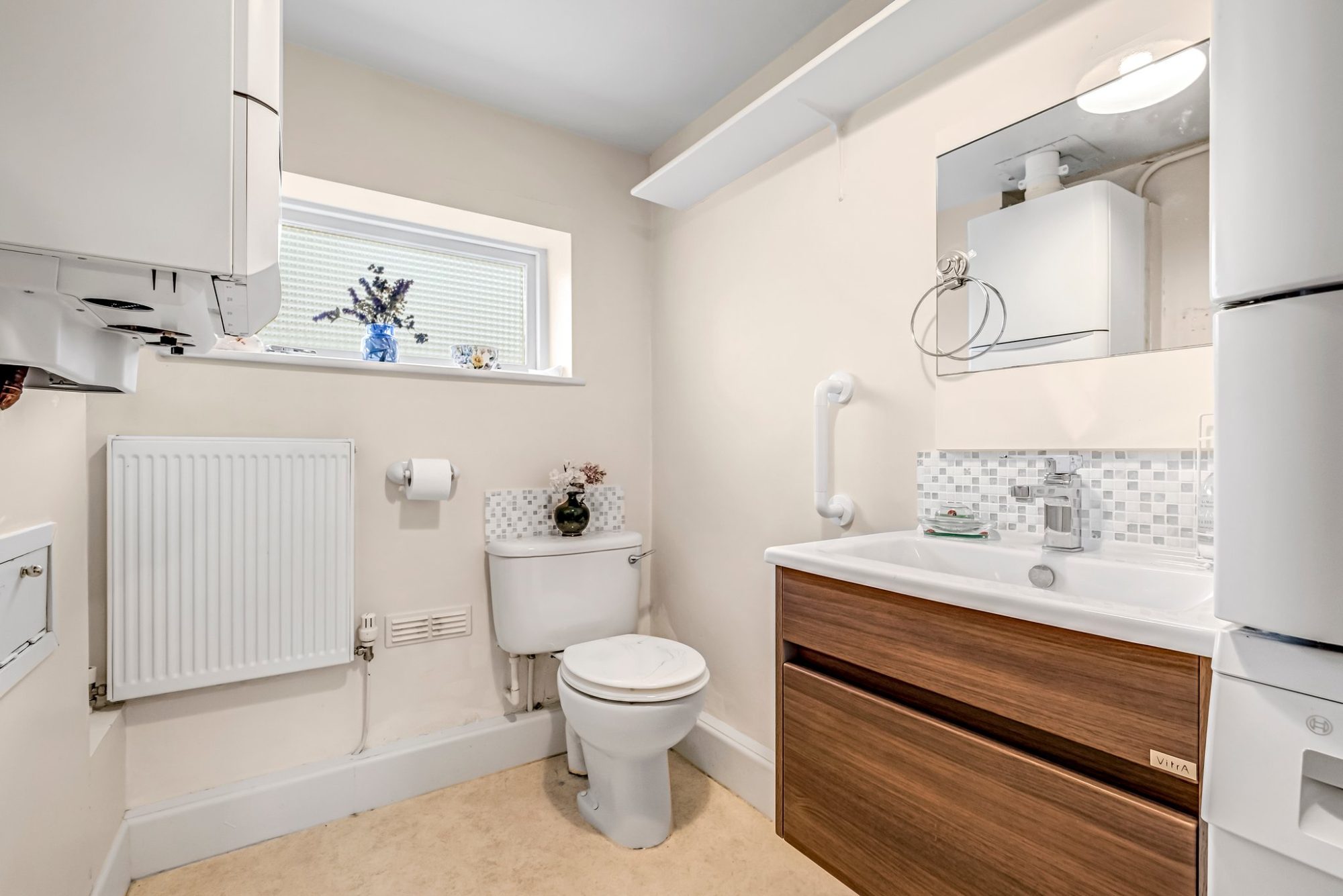 Fitted with a two piece white suite, a w.c and a wash hand basin with a drawer below. Plumbing for a washing machine, frosted glass double glazed window, radiator and wall mounted gas combination boiler.