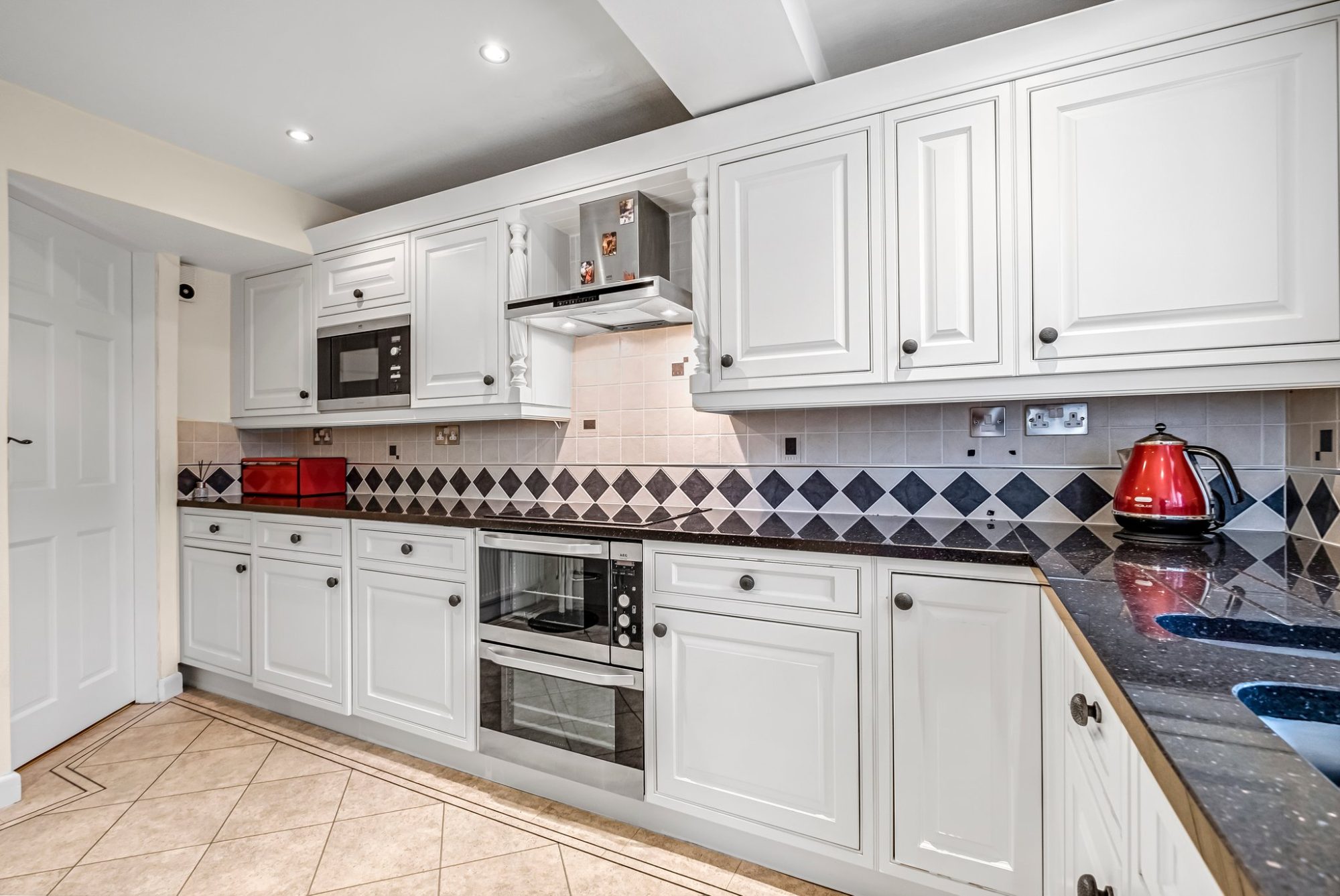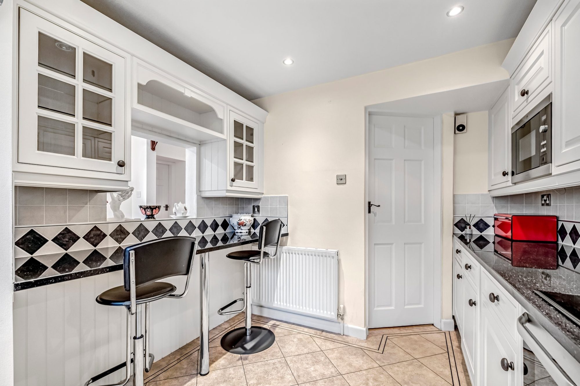 The nice sized kitchen is fitted with wood fronted units and drawers, Quartz worktops with tiled splashbacks and a one and a half bowl sink with a mixer tap. There is a further Quartz worktop with tiled splashback that provides a breakfast bar with two glazed wall mounted display units above. Built-in electric double oven/grill, a ceramic hob with a stainless steel canopy over and integral fridge/freezer. Double glazed window, Karndean flooring, radiator and downlights recessed into the ceiling.