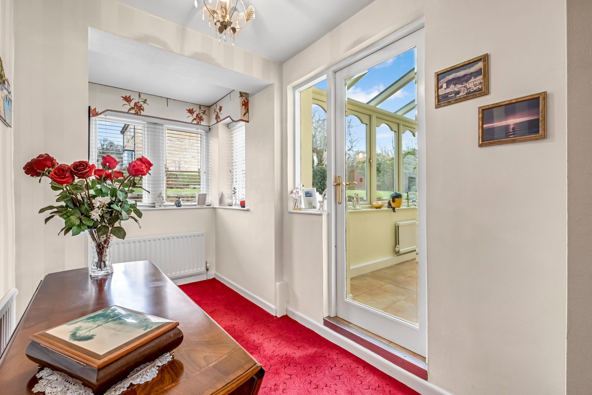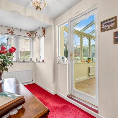 Wooden entrance door. There is a double glazed window, a radiator and a glazed door allowing access into the hallway.