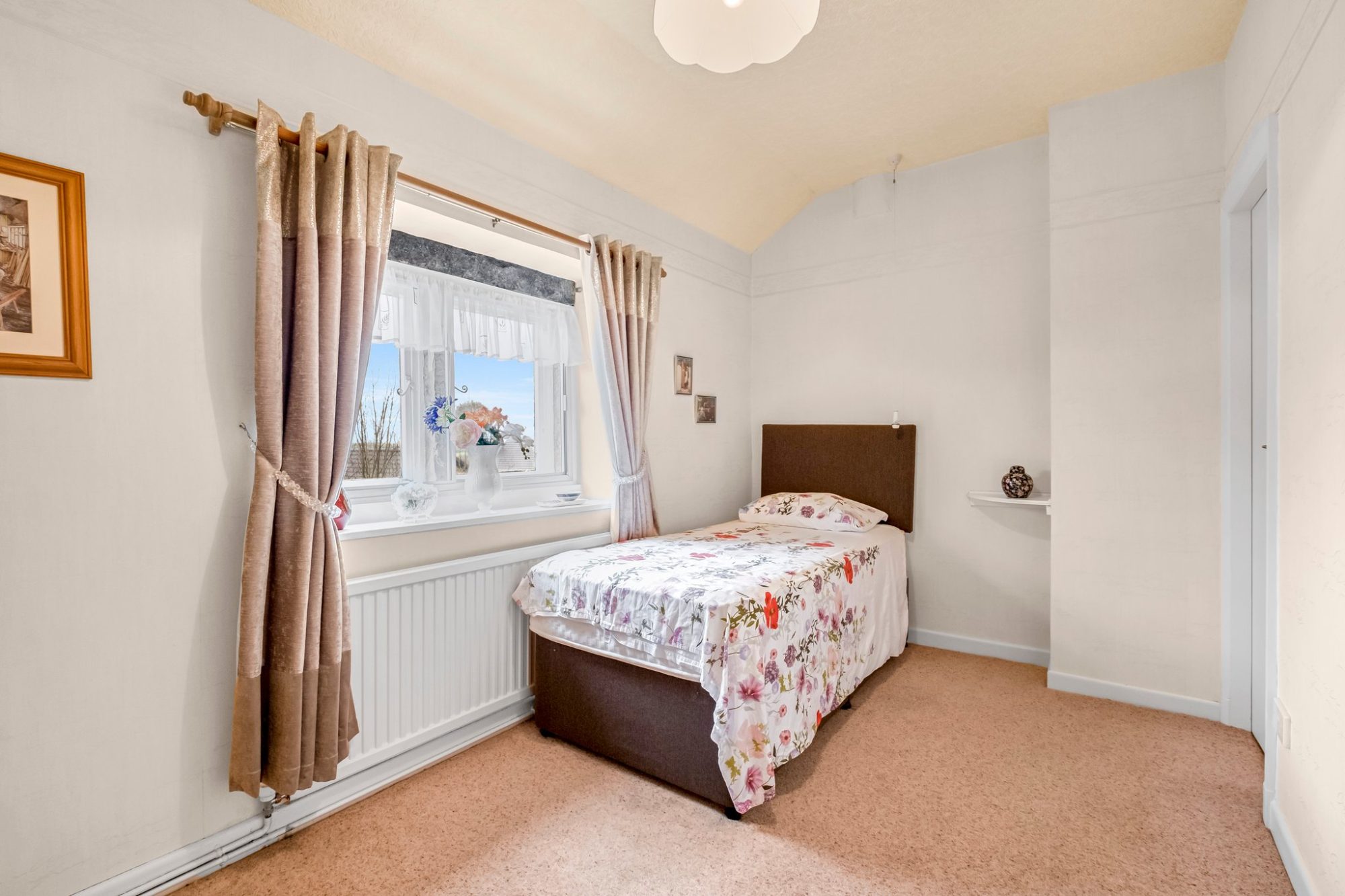 Providing a large single or small double which has a built-in double wardrobe with storage cupboards above, a radiator and window with secondary double glazing.