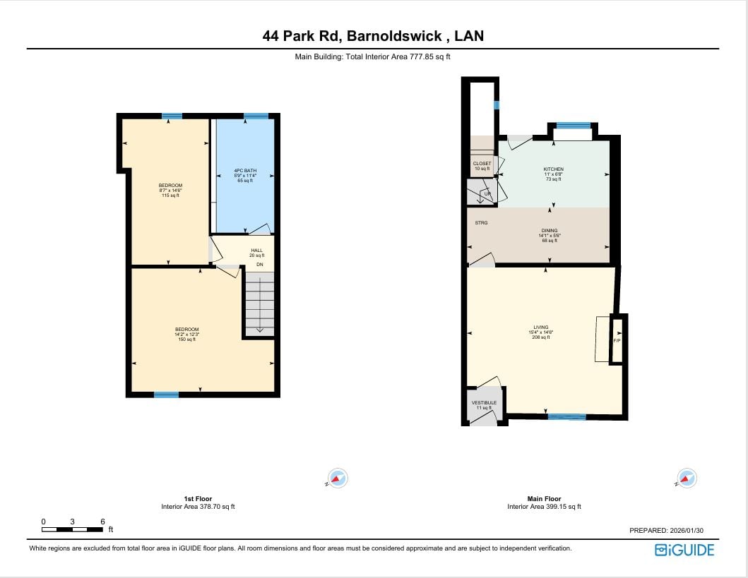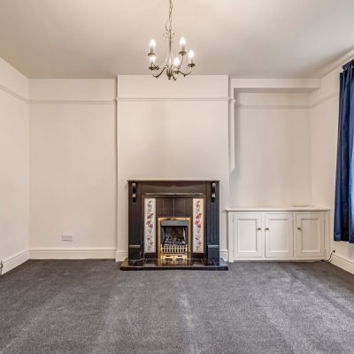 The ground floor begins with an entrance vestibule leading into a spacious front living room, enhanced by a large window that allows natural light to fill the space and a charming fireplace fitted with a gas fire, creating a warm focal point. There is a well-designed dining kitchen, fitted with modern cream shaker style units, oak style countertops, a gas hob, electric oven, and access to a handy store room/pantry.