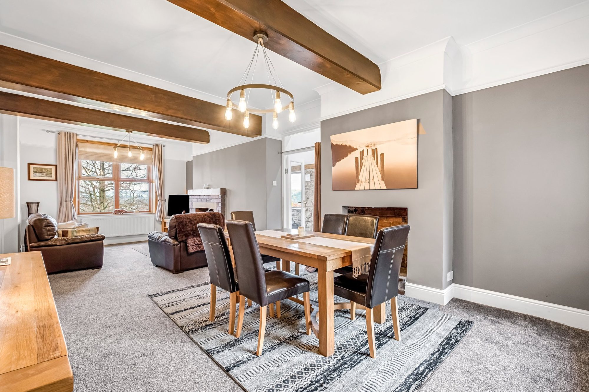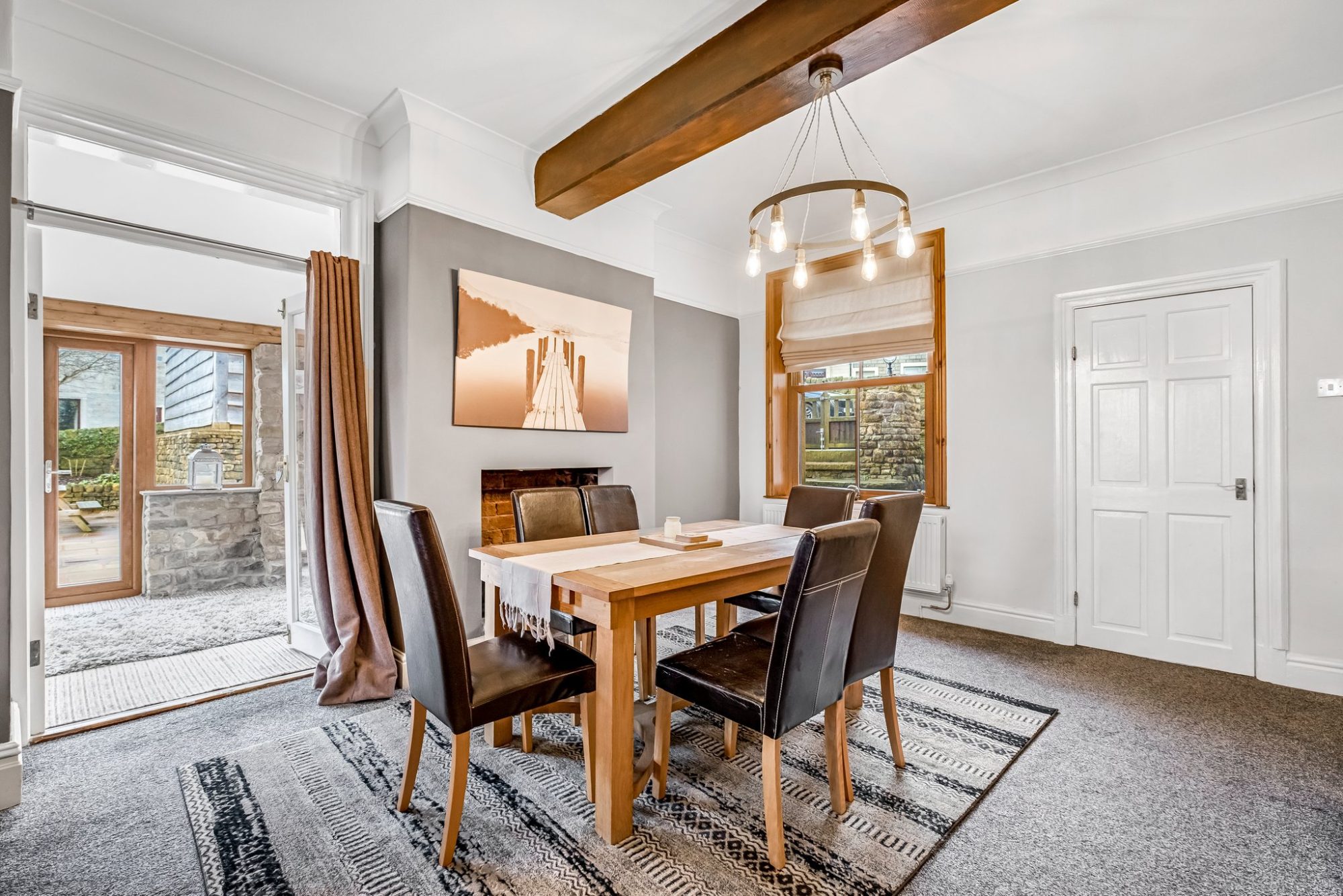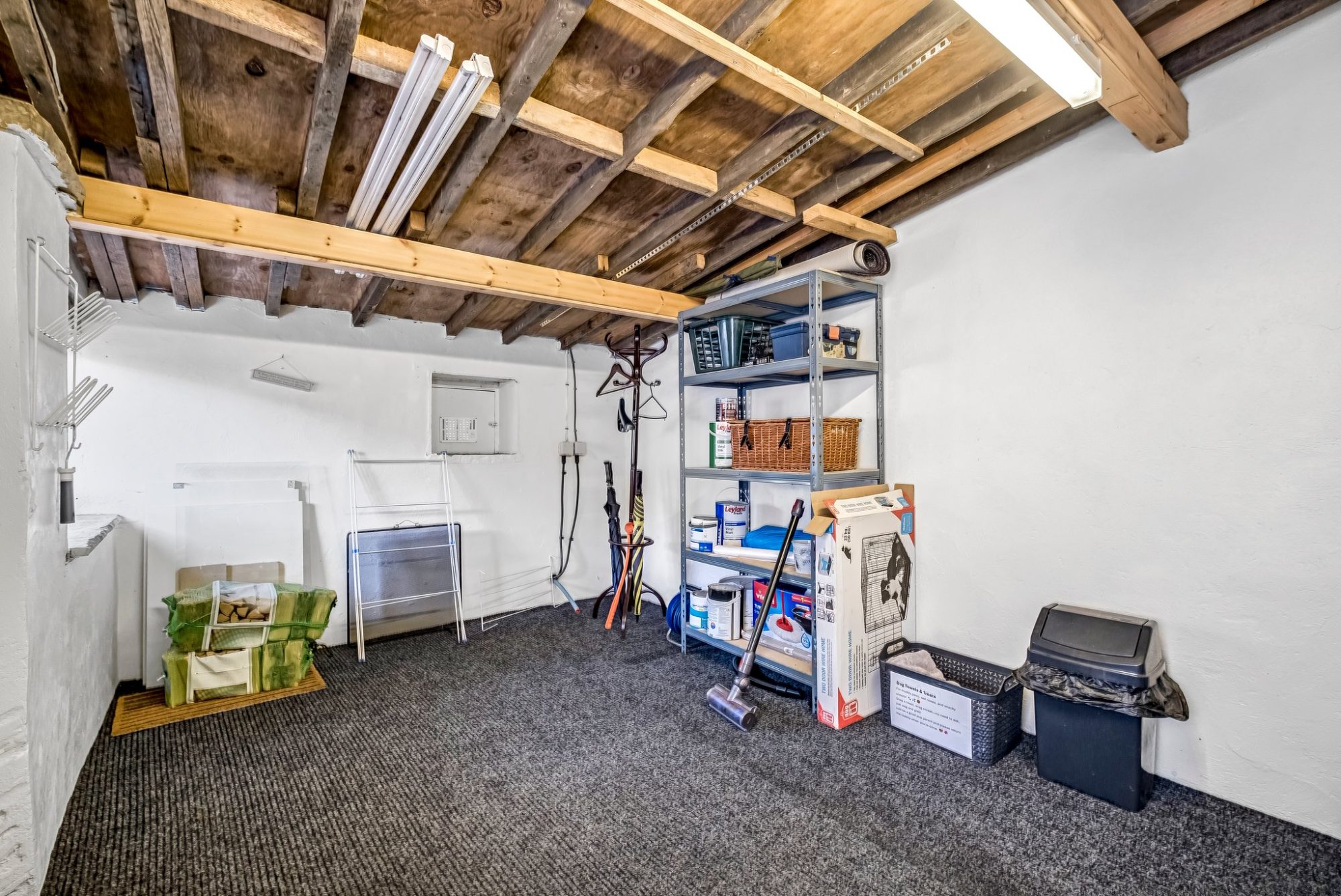 From here, the home flows effortlessly into the open plan lounge and dining room, a beautifully finished space adorned with oak ceiling beams, a feature brick fireplace housing a multifuel burner, and an oak mantelpiece. Large windows frame breath taking views across Trawden and Pendle Hill. Double doors lead into a superb sun lounge, showcasing exposed stone walls and tranquil outlooks over the garden and surrounding countryside. A handy storage room sits neatly beneath the staircase leading to a wine cellar.
