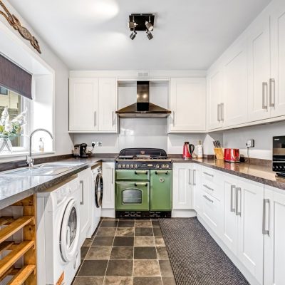 Entering via the kitchen, you are greeted by a sleek and modern design featuring white cabinetry, contrasting black worktops, a striking British Racing Green Rangemaster cooker, and a built in American style fridge freezer.
