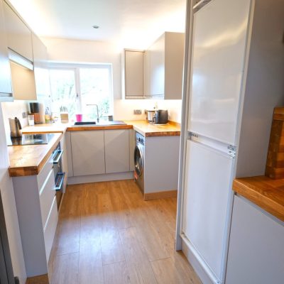The kitchen has been tastefully refurbished with modern units, solid wood worktops, concealed lighting and a single drainer sink with a mixer tap. Built-in electric double oven/grill, induction hob and extractor fan hood over and plumbing for a washing machine. PVC double glazed window, downlights recessed into the ceiling, a contemporary upright radiator and an internal door giving access to the attached workshop.