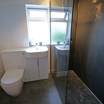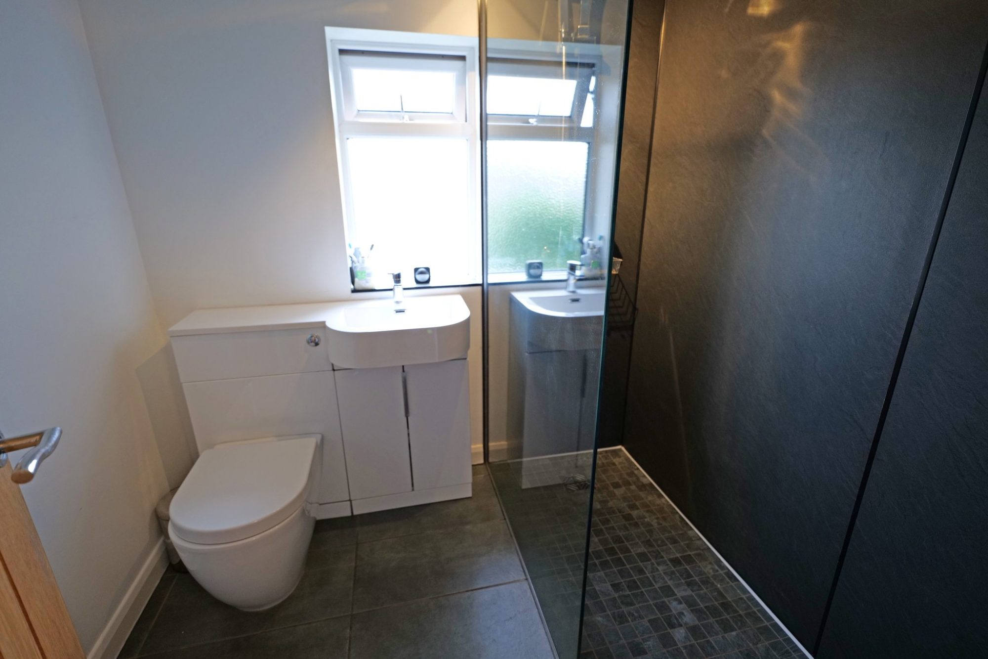 The stylishly refurbished shower room is fitted with a modern three piece suite comprising a walk-in shower, with a 'rainfall' style showerhead and an additional shower, floor to ceiling pvc wet wall splashbacks and a glazed shower screen, a w.c and wash hand basin with a mixer tap, encased in a base unit. Chrome radiator/heated towel rail, pvc double glazed frosted glass window and a tiled floor.