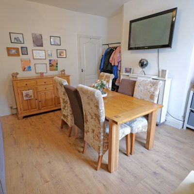 This spacious room has been opened up into the kitchen and has a wall mounted gas fire (not in working order) and sits on a stone hearth. PVC double glazed window, wood effect laminate flooring, a radiator and a useful understairs storage cupboard which has electric power and light.