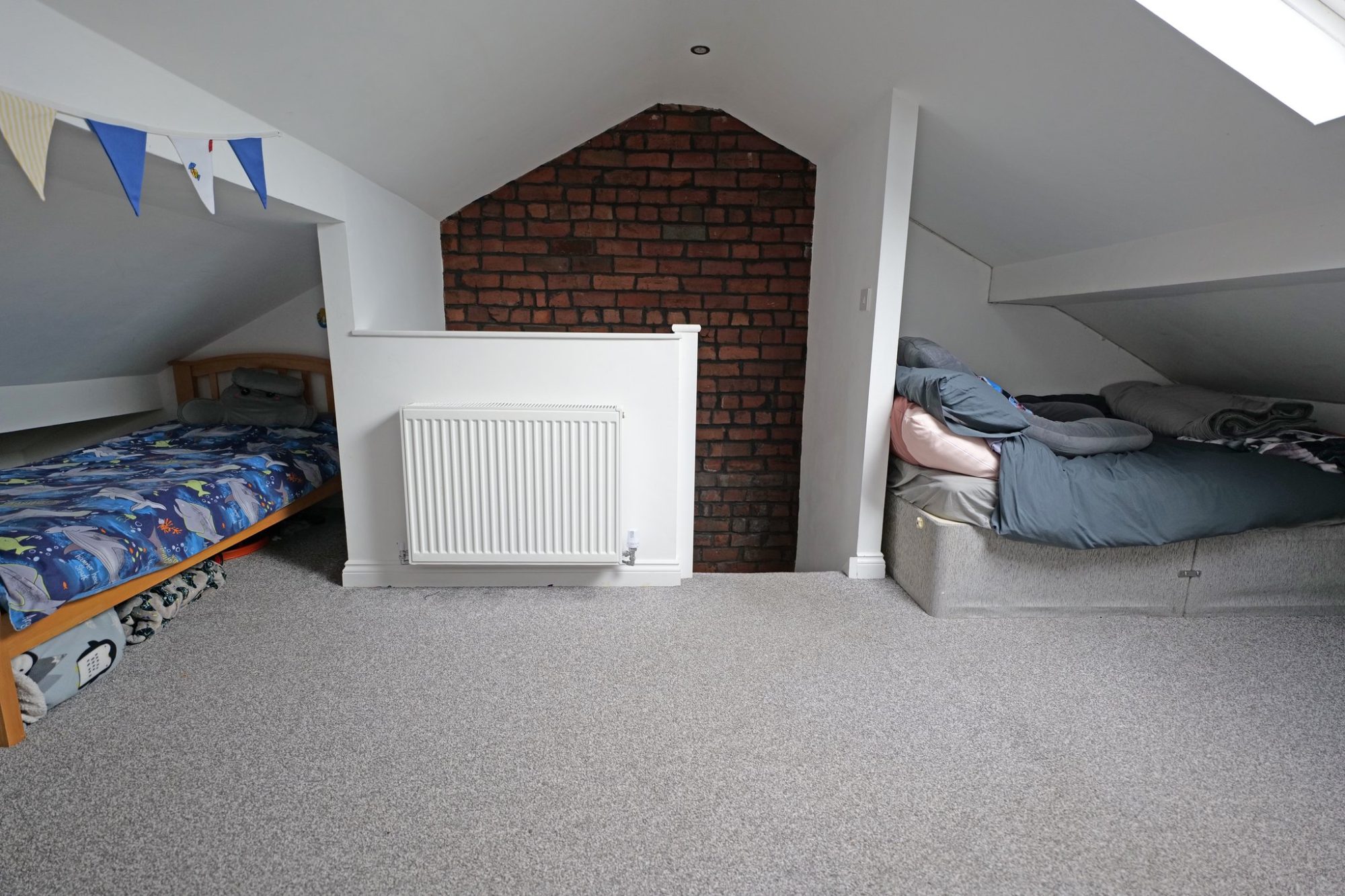 To the first floor are two bedrooms, consisting of a spacious double and a single, along with a larger than average bathroom, fitted with a three-piece white suite with an electric shower over the bath. On the second floor is a fabulous attic bedroom, offering versatile and generous space, ideal as a primary bedroom or shared use.