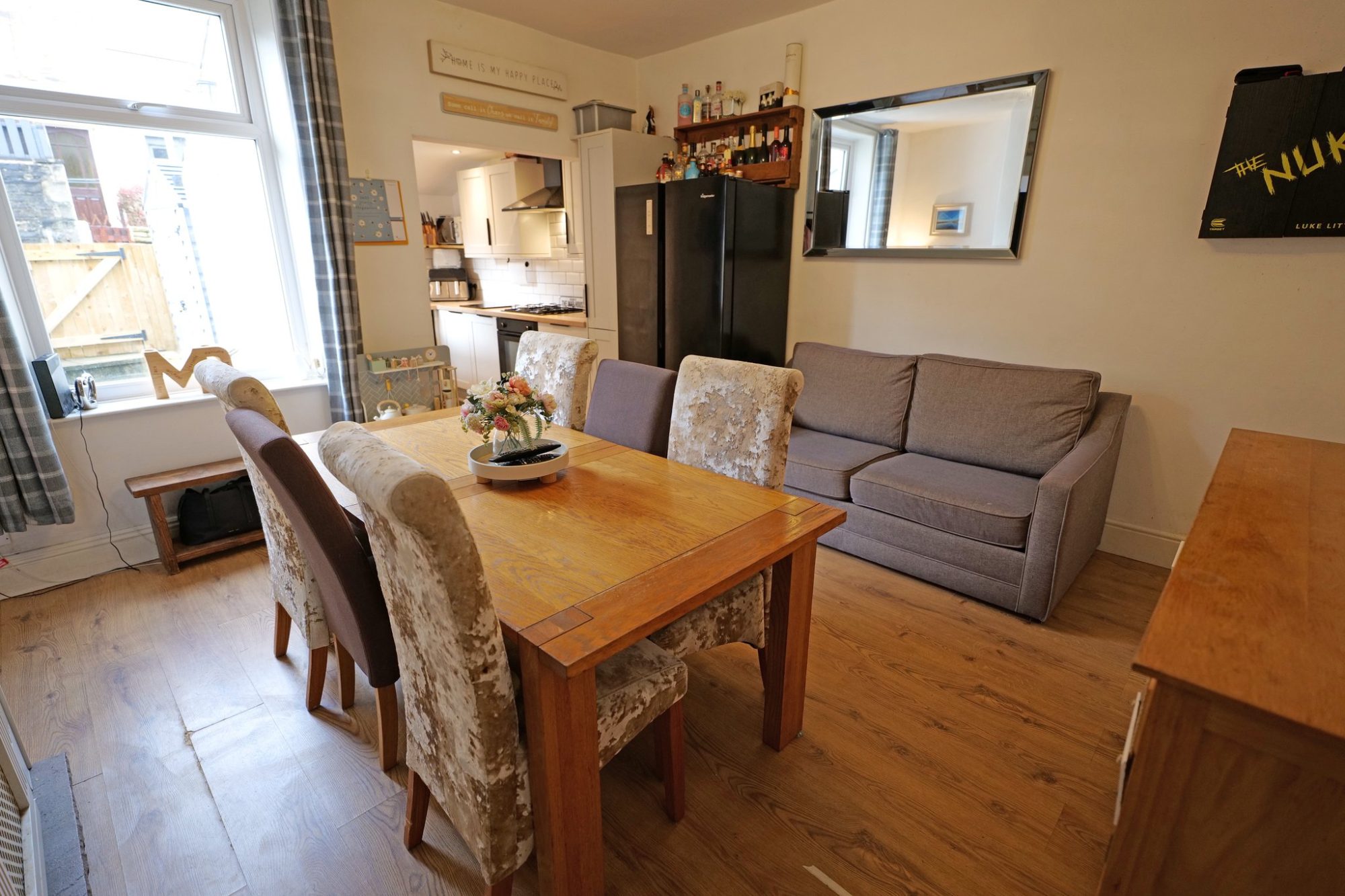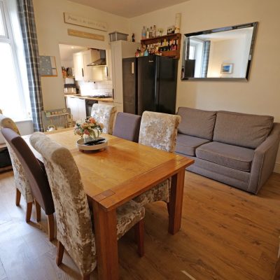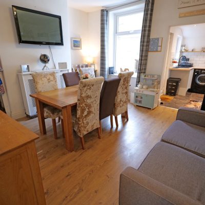The accommodation briefly comprises a good-sized sitting room, featuring a fireplace with an electric fire, together with an open plan living/dining room and kitchen, perfectly suited to modern day living. The kitchen has been recently re-fitted with stylish shaker style units, wood effect laminate worktops and a built-in electric oven and hob.