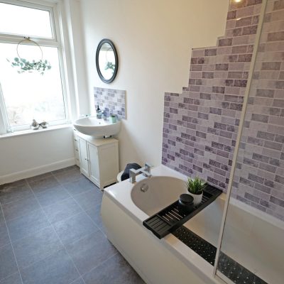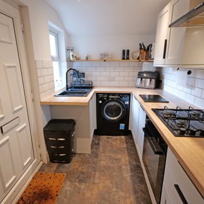 This stylish refurbished kitchen has been tastefully fitted with modern wood fronted shaker style units, wood effect laminate worktops and tiled splashbacks and a one and a half bowl sink with a hose style mixer tap. Built-in electric oven and a gas hob with a stainless steel extractor canopy over and plumbing for a washing machine. PVC double glazed window, downlights recessed into the ceiling, tiled floor and a pvc external door.