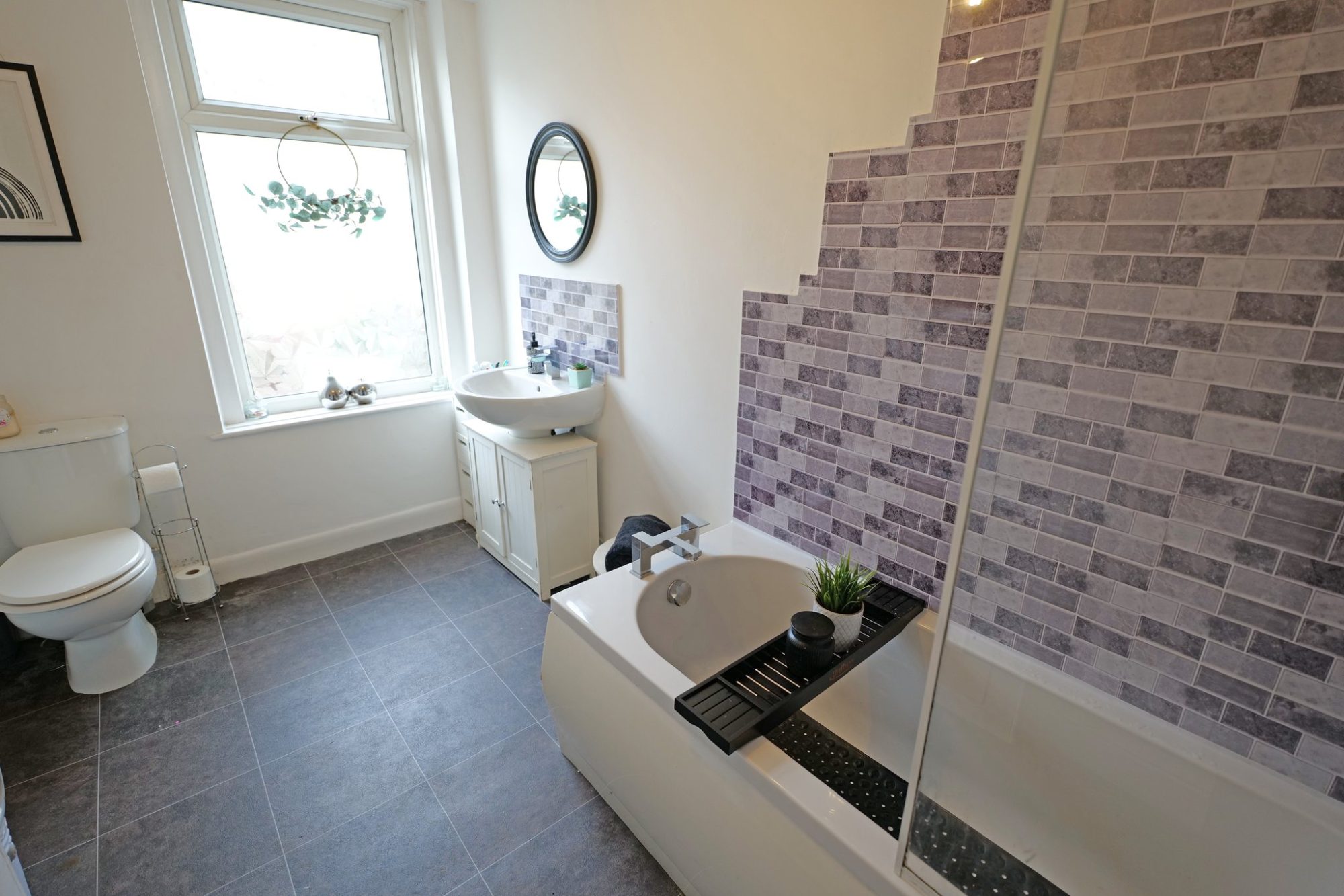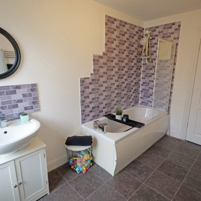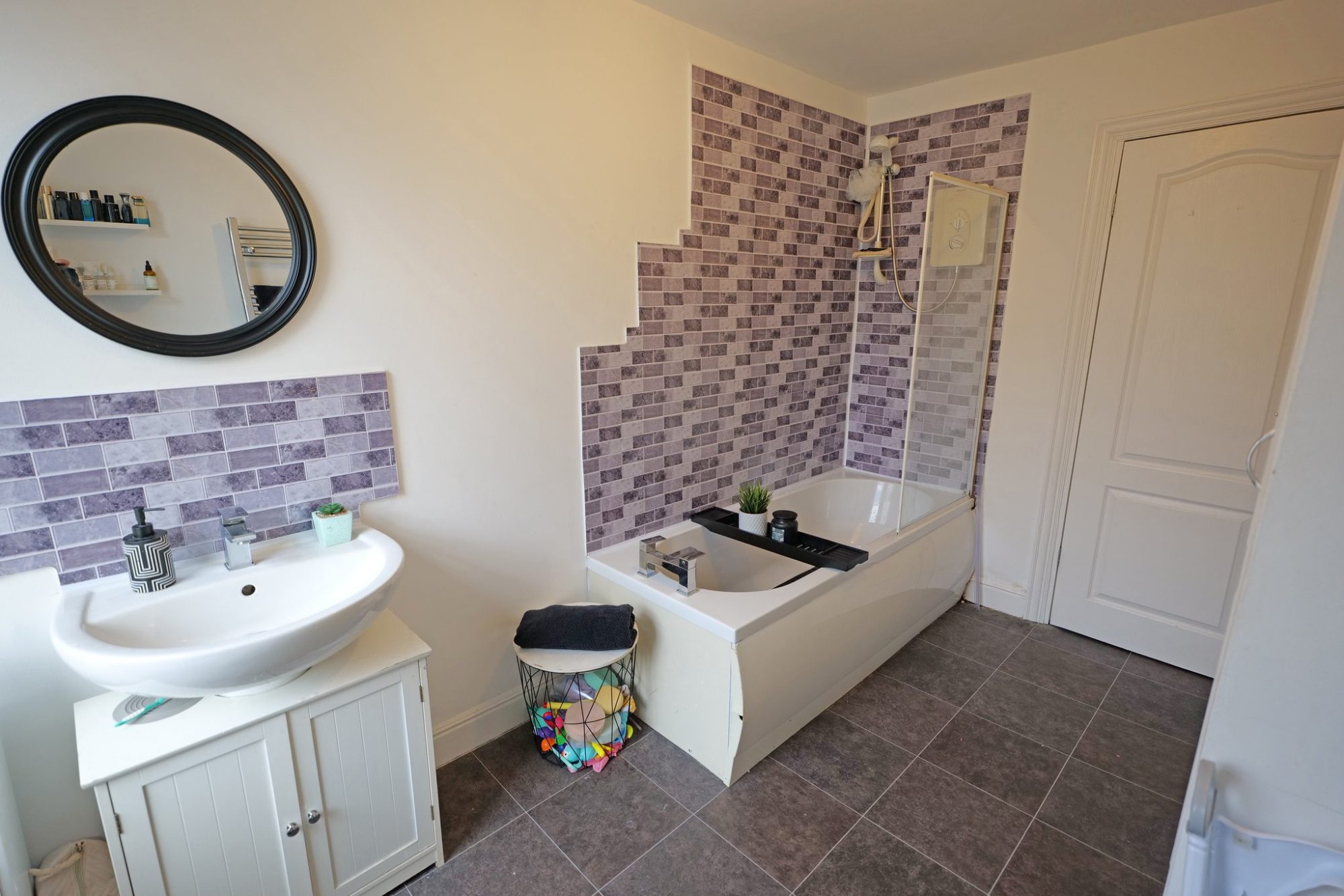 Larger than the average bathroom and fitted with a modern three piece white suite, comprising a bath with a mixer tap and an electric shower over with a tiled splashback and a glazed shower screen, a w.c and a pedestal wash hand basin with a mixer tap and tiled splashback. Chrome radiator/heated towel rail, tile effect laminate flooring and a pvc double glazed frosted glass window. There is a built-in storage cupboard that houses the gas combination boiler.